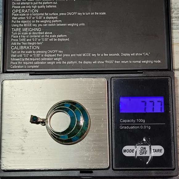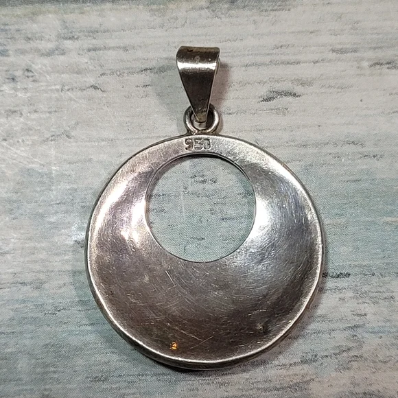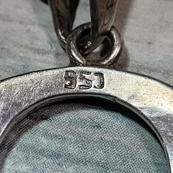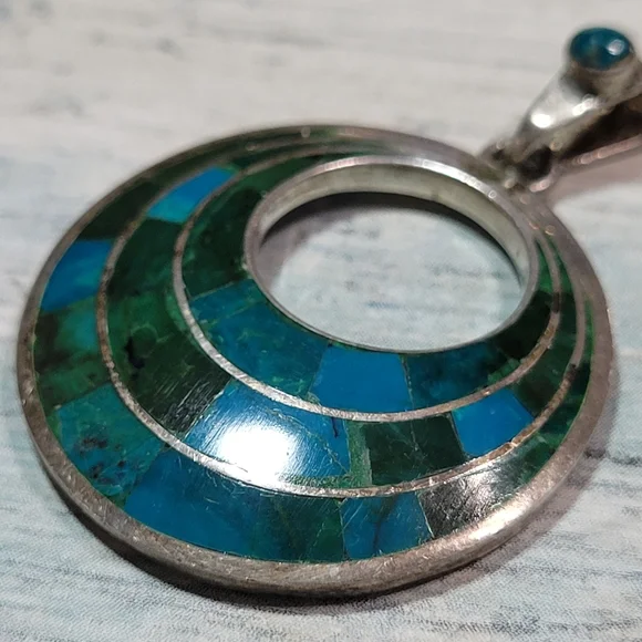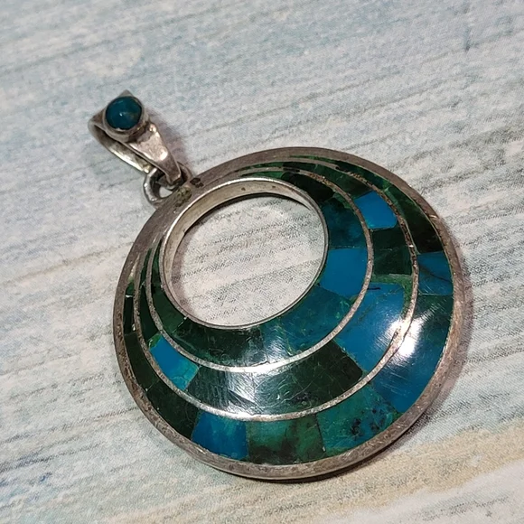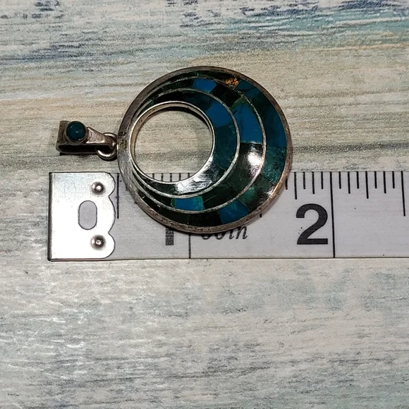 Pre-Own 950 Turquoise Inlay Open Round Pendant.Color: Blue, Green and dilver tone.Size: 1.75"in aprox.7.77 grams of weight.950 Stamped or marked back.Note: This Pendant has signs of worn, also have patina or Tarnish. I don't clean when are sale.Aproximate measurements as Flat lay.Accepting reasonables Offers 🛍 1396-5-2