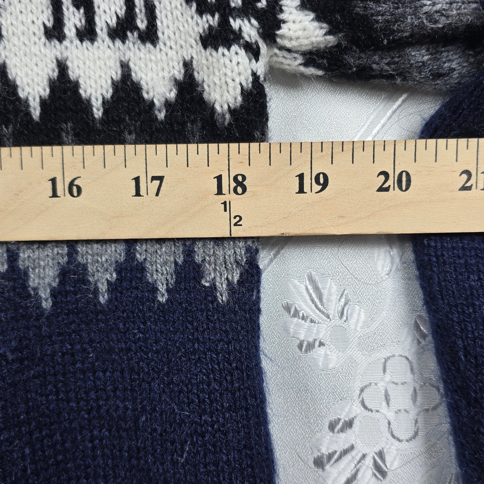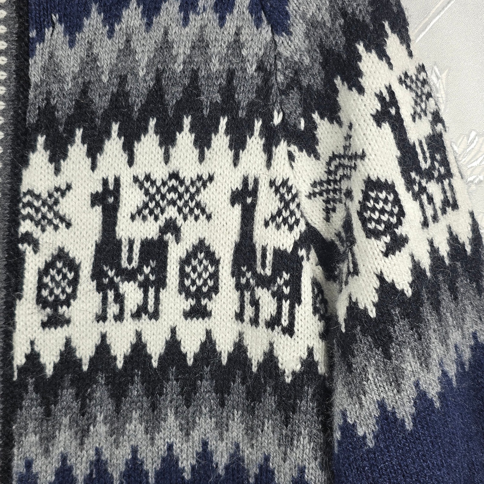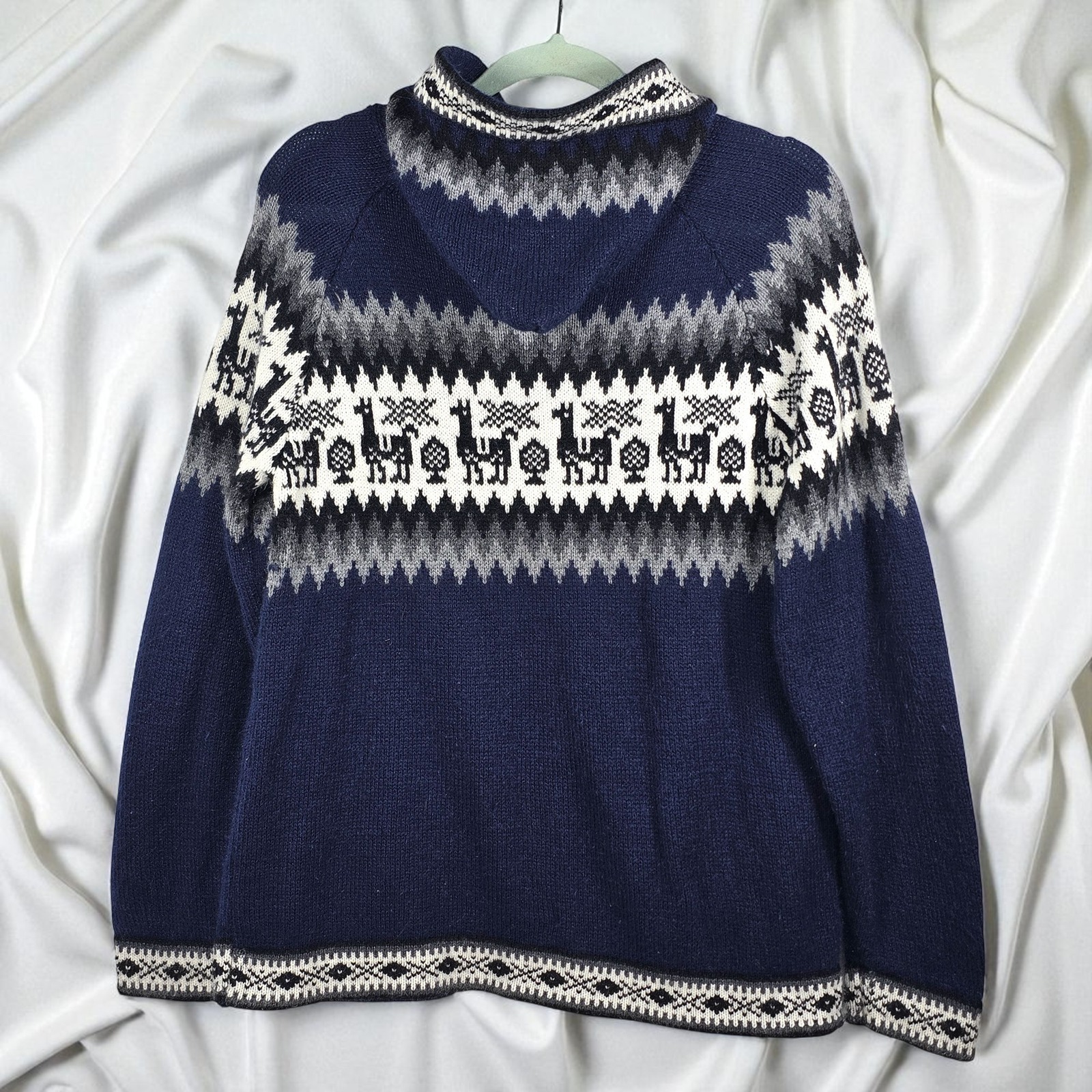 Stylish hooded cardigan sweater, featuring a unique blend of comfort and eye-catching design. This knitwear showcases a rich navy hue complemented by intricate Aztec-inspired patterns in gray and white. The design includes charming llama motifs that add a touch of whimsy and cultural flair. It also features a full zip closure, practical front pockets, and a cozy hood, enhancing both functionality and style. The cardigan is meticulously crafted with detailed patterns along the trim, pockets, and zipper line, demonstrating high-quality craftsmanship.