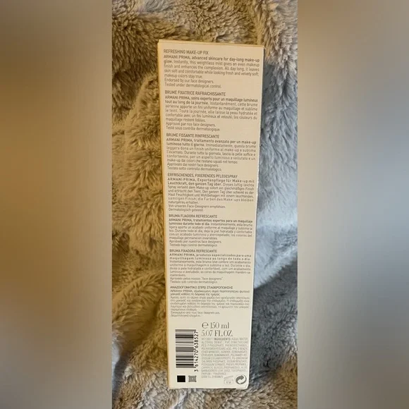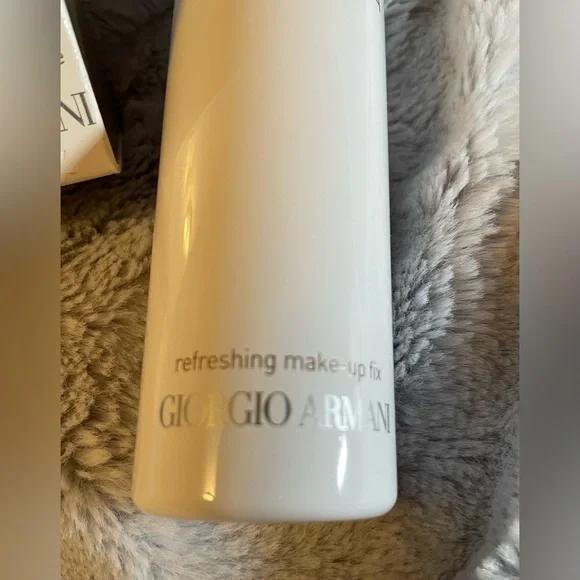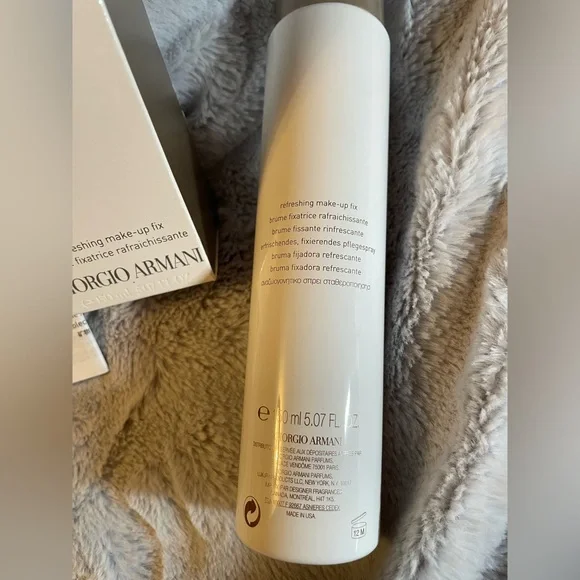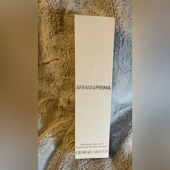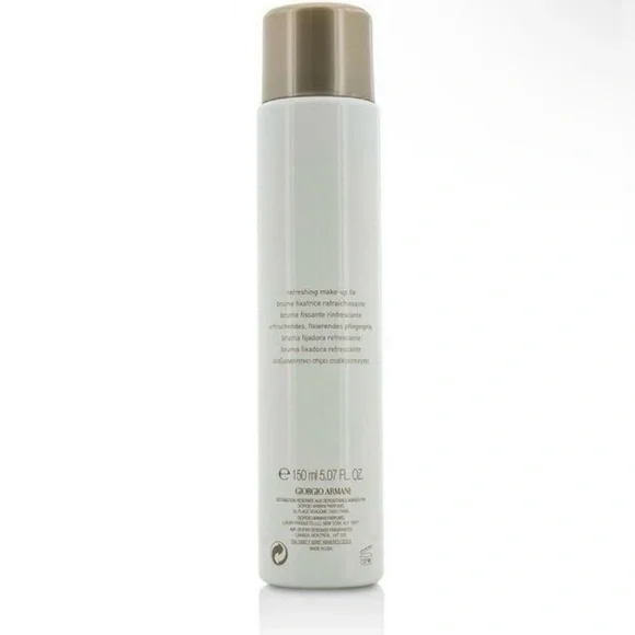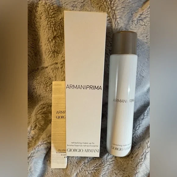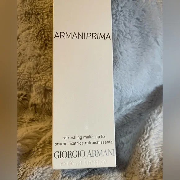Elegant makeup setting spray. Sleek design with a luxurious feel. Perfect for a flawless finish. Brand new in box, larger size 5 oz/ 150 mL. What It IsA hydrating, on-the-go makeup spray that perfects, protects and refreshes makeup while illuminating the complexion for a fresh, instant glow that stays all day.What It DoesAdorning the face with a luxurious veil of moisture, the Armani Prima Refreshing Makeup Fix face mist provides instant freshness with an uplifting fragrance. Applied on bare skin, this lightweight mist, enriched with Rose Centifolia, offers an instant glow for a luminous complexion. Deeply hydrated all day long, skin feels smooth, supple and revitalized. When applied on top of makeup, colors stay true with a long-lasting hold.FREE OF...- Parabens- Sulfates- PhthalatesHow To Use ItShake before use, then close eyes and spray eight to ten inches away from the face misting directly onto skin. Spray after your skin-care routine to help tone and boost skin's radiance, after makeup application to hold it in place, or reapply throughout the day to refresh skin's look and feel.Apply morning and/or at any time of day on bare skin or on top of makeup as an essential step of Armani Prima daily routine.Product Features• 5 fl oz.