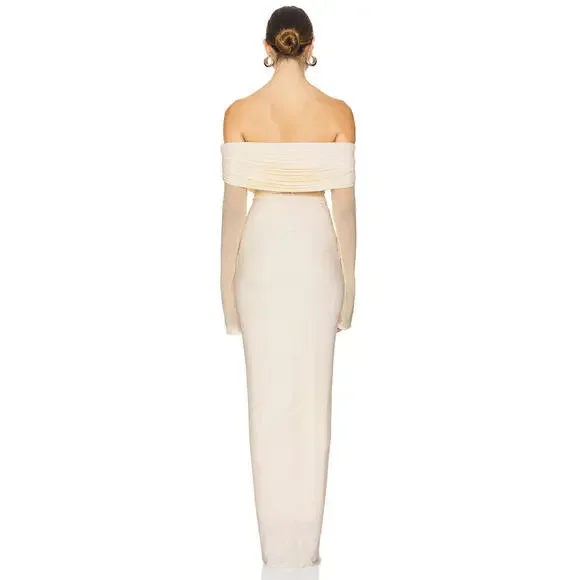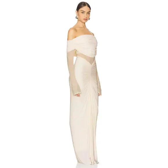 Jersey textileImportedDry clean recommendedUnlinedPull-on off the shoulder stylingMesh paneling at sleeves and bodiceMidweight slinky jersey fabricNeckline to hem measures approx 62" in lengthRevolve Style No. DEBY-WD9Manufacturer Style No. DBG_FE_001Neckline to hem measures approx 62" in lengthwaist 28"