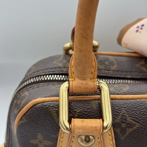 Louis Vuitton Manhattan PM size bag with lock and key. Two front pockets with push button closures and clean suede interior with slip pocket. Vachetta handles have some water stains and very minor cracking on piping as shown. Otherwise leather and patina are excellent still light colored. Comes with dustbag no box. Reposhing from @_eow_ an authorized authenticator and will include her card.