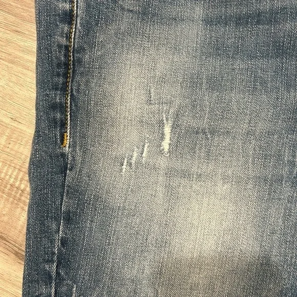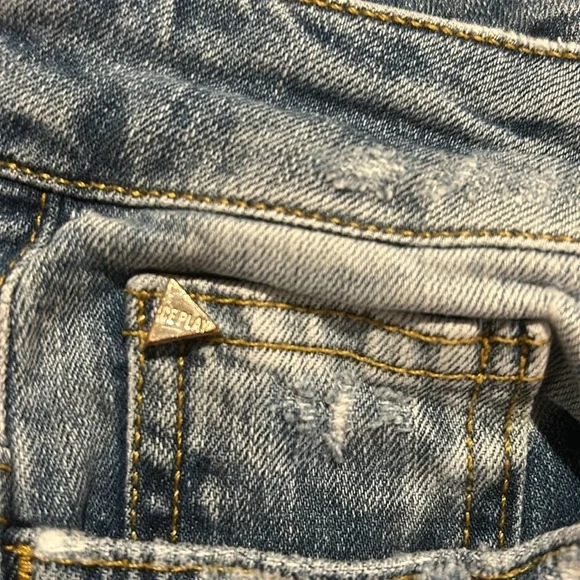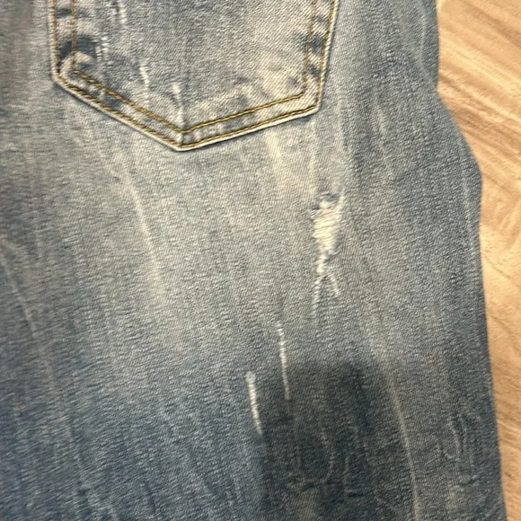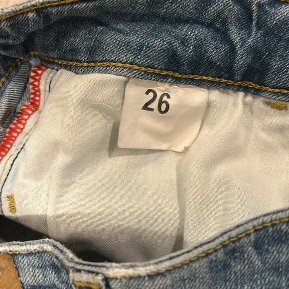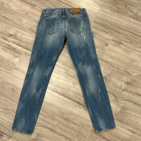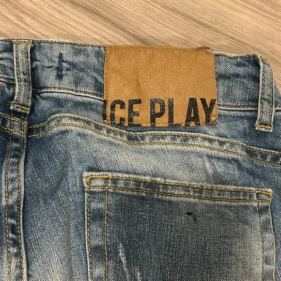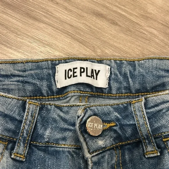 Ice Play jeans in a distressed style, available in size 26. **Measurements:**- **Waist:** 14 inches (measured across the waistband, providing a comfortable fit at the hips)- **Rise:** 8 inches (the distance from the crotch seam to the top of the waistband, giving a mid-rise silhouette)- **Inseam:** 28 inches (the length from the inner leg to the hem, suitable for a cropped or ankle-length look)These jeans combine trendy distressed detailing with a flattering fit, making them a stylish addition to any wardrobe. Perfect for casual outings or dressing up with the right accessories!