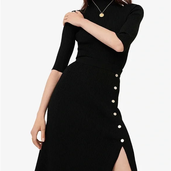New with tagProduct DetailsParisian ready-to-wear label Maje proves the power of a classic, understated style yet again.Formed from a supremely soft knit with plenty of stretch for flexibility, this Jupiter midi skirt is modernised thanks to gold-tone buttons that run up the side slit. The ribbed texture adds an extra element of warmth for the cooler days.- 53% viscose, 45% polyamide, 2% elastane