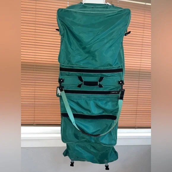 This Members Only garment bag is a vintage piece from the 80's. It comes in a refreshing mint green color and is made of durable nylon material. With adjustable straps and the ability to be used as a carry-on, this bag is perfect for any unisex adult traveler. The bag features a solid pattern, is equipped with 6 zipped pockets, and is designed for large-sized items, such as clothing. It is a great addition for any travel enthusiast and can be used for both business and leisure trips.