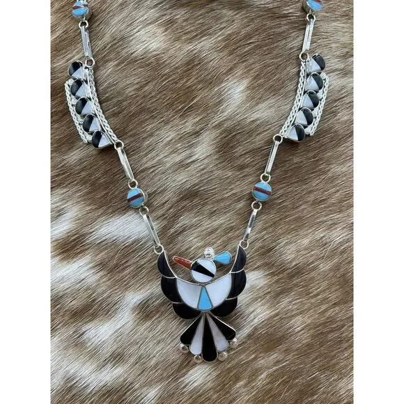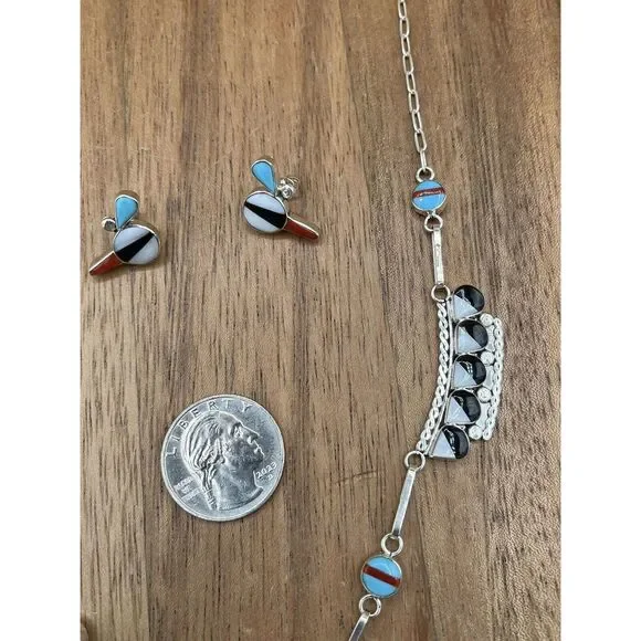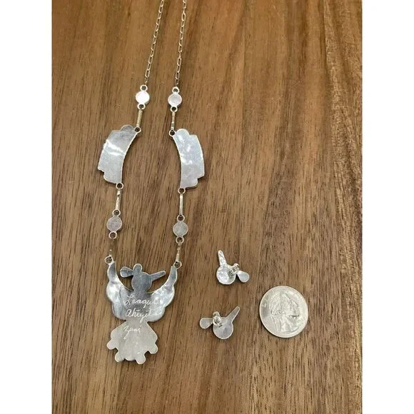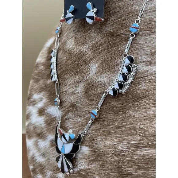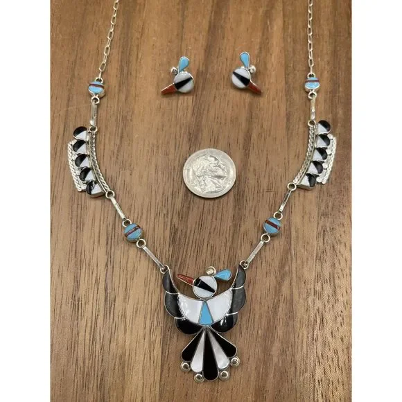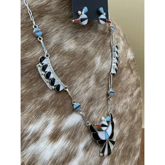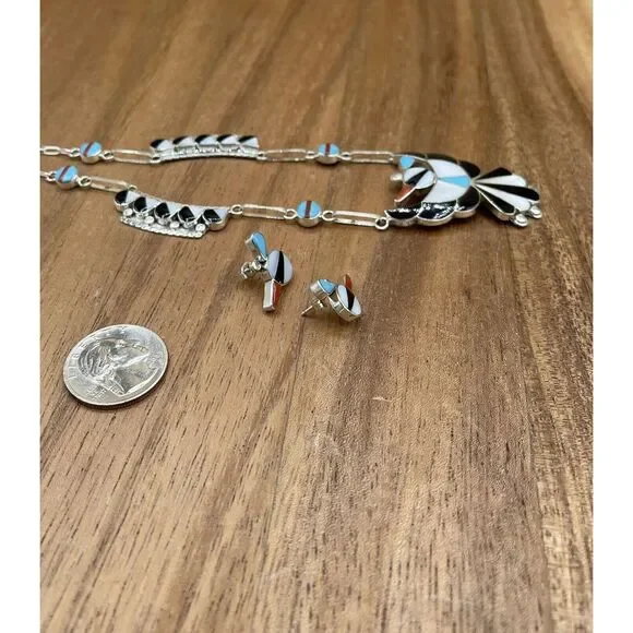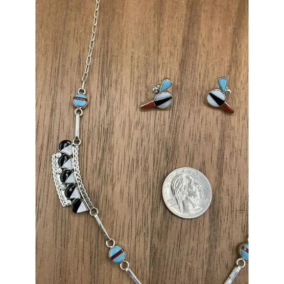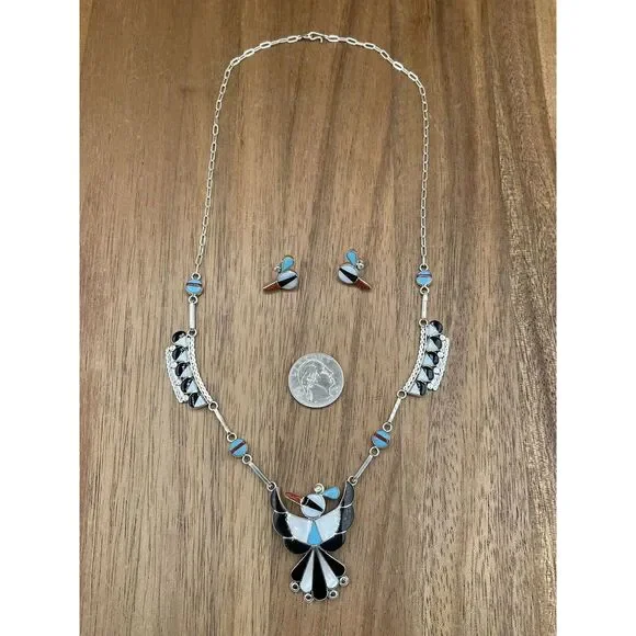 This is a Zuni handmade jewelry set consisting of a necklace and earrings with an inlay diamond design. The set is made of .925 sterling silver and features inlay Kingman turquoise stones. The necklace and earrings are signed and stamped by the artisan Leagus Ahiyite, and is of Native American ethnic and regional style. The set is a beautiful representation of Zuni craftsmanship and is a unique addition to any jewelry collection.Necklace Weighs: 21 grams (without earrings) Necklace length: 22” (11” each side without drop piece)Earrings weigh: 2.5 grams Drop Pendant size size: 1 3/4” x 1 1/4”Earring size: 1/2” x 3/4”Reference coin is a quarter ‼️Please feel free to contact me with any questions thank you!🫶🏽Make sure to also follow mystore for new items posted daily 💕