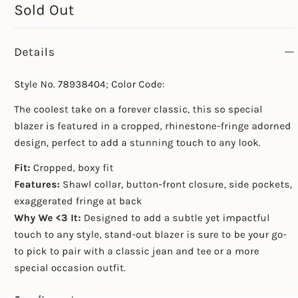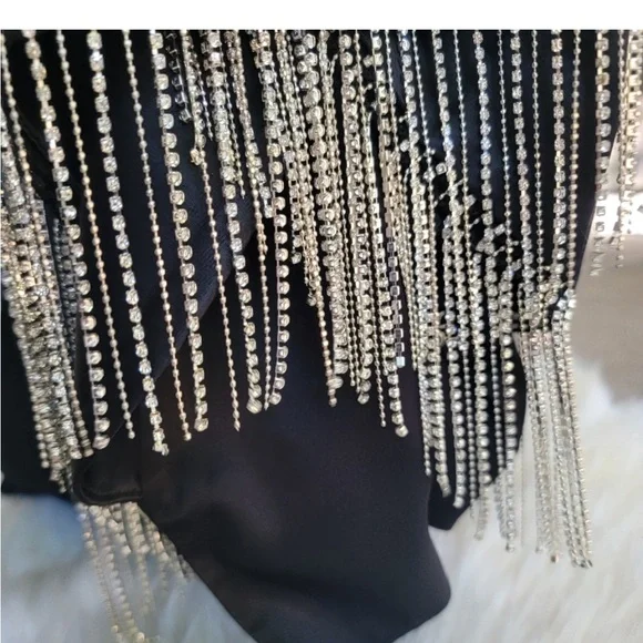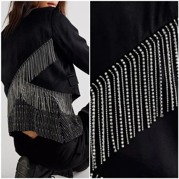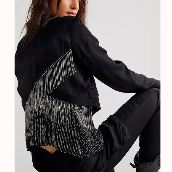 FREE PEOPLE Deena Cropped Blazer Jacket in black satin fabrication with rhinestone-fringe trim throughout. • Smooth feel w/ soft satin sheen • Shawl collar• Hook & Eye closure at front• Side pockets• Exaggerated fringe at back• 100% Viscose• Dry CleanApprox MMTS for size Small:- Bust:39”- Length:19.5” - Sleeve Length:25”*** NEW WITH TAG 🏷️ NWT ***