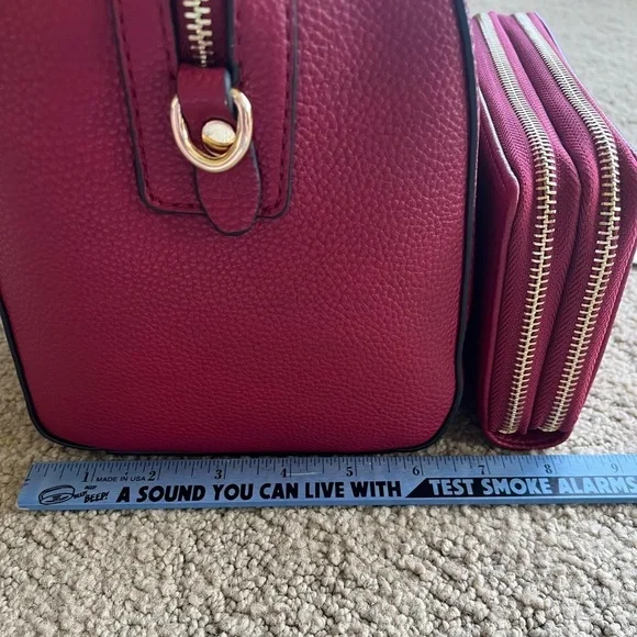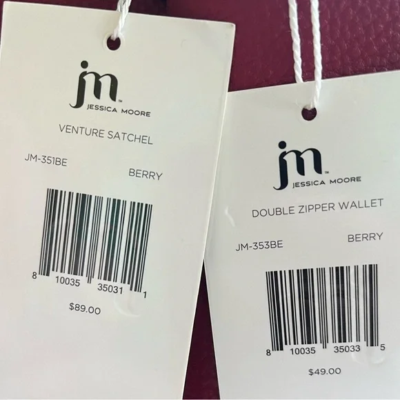 New with tags in all original packaging, never usedPerfect condition, no flaws. Price is for both bag and walletJessica Moore Venture Satchel and matching double zip wallet in berry color. Vegan pebble leatherIncludes cross body strap Retail $89 purse; $49 walletMakes a great gift for yourself of others!Jessica Moore Venture Satchel is spacious enough for all the essentials. Convenient exterior handles, and additional extended strap. Two open sections, middle and side zippered pockets. Carry by hand or wear it as a crossbody. 11x9x6.5”