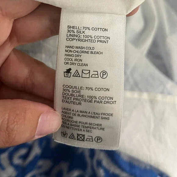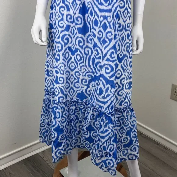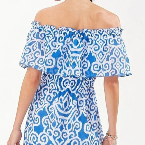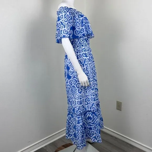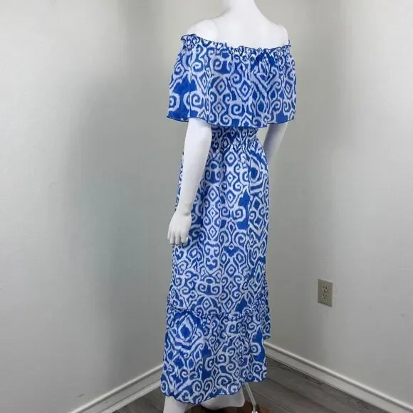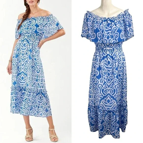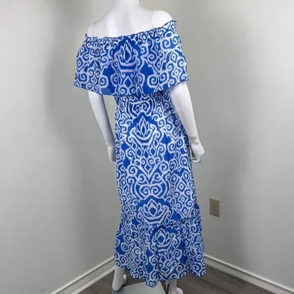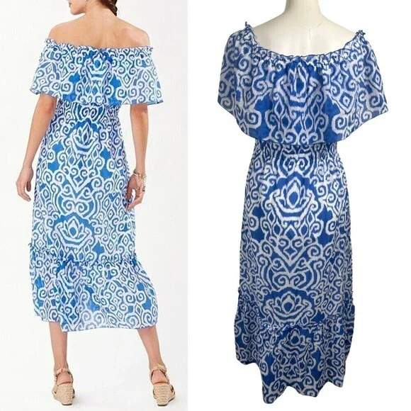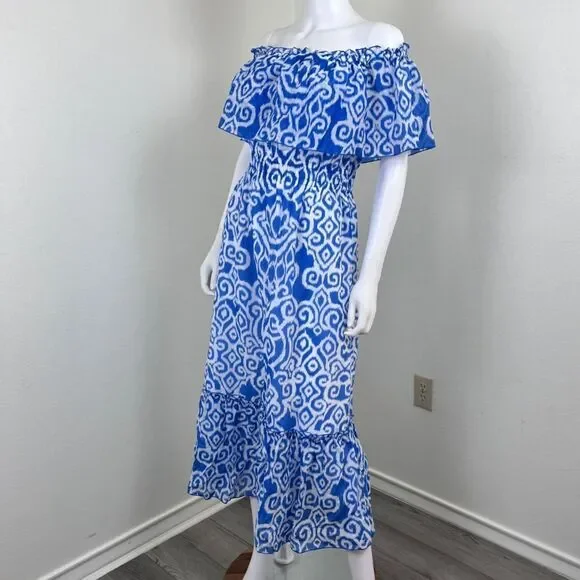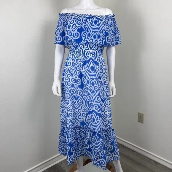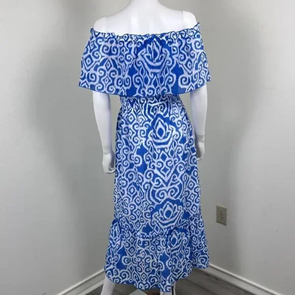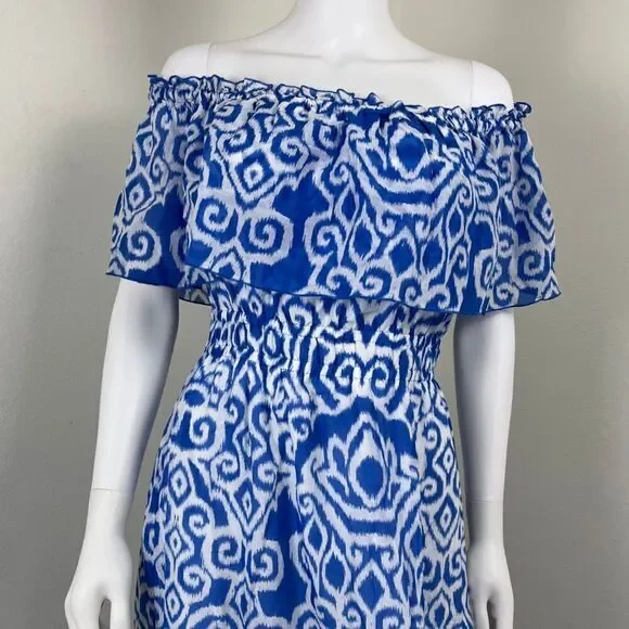Size: SmallColor: Blue/WhiteVacationIntricate patternBody: 70% cotton, 30% silk. Lining: 100% cottonOff-the-shoulder elastic necklineElastic waistlineTiered HemLinedmidi lengthPulloverMaterial: Cotton/silkRuffleLightweightMeasurment in picture/all measurement are approx.In great pre-owned condition. No flaws. No stains