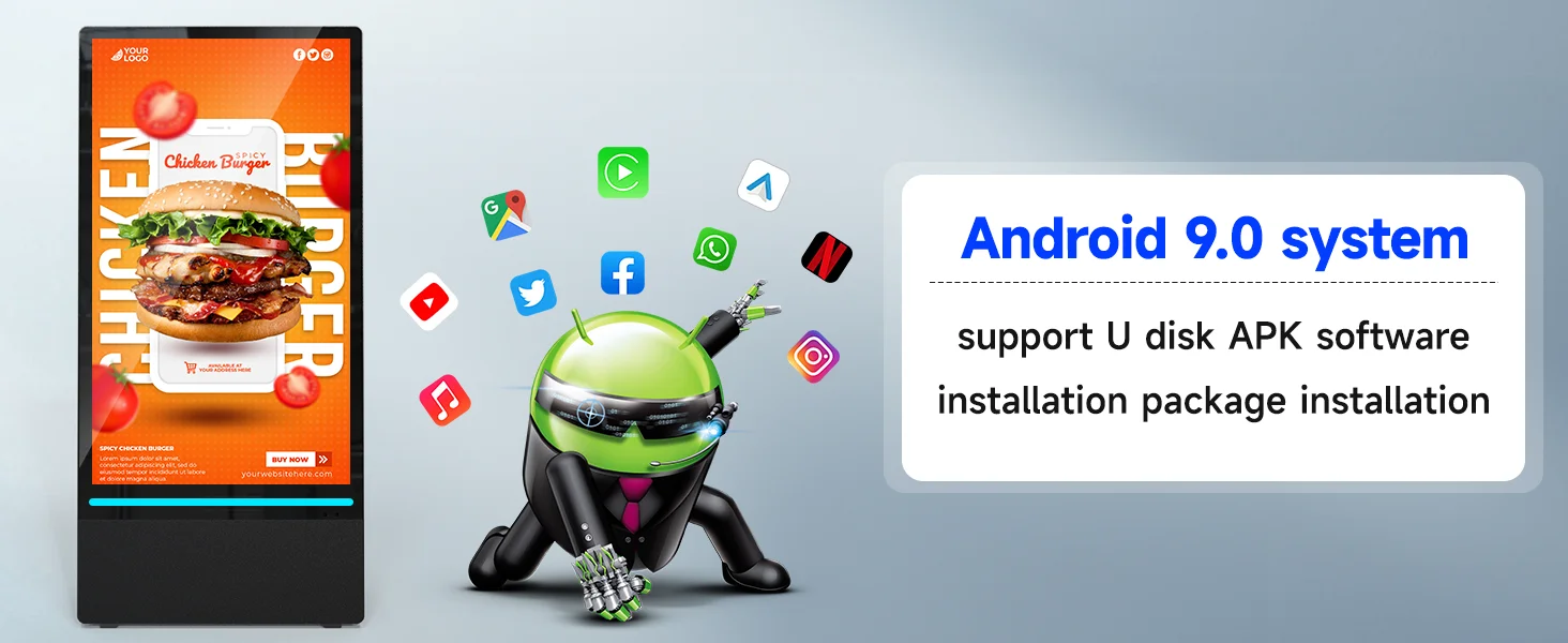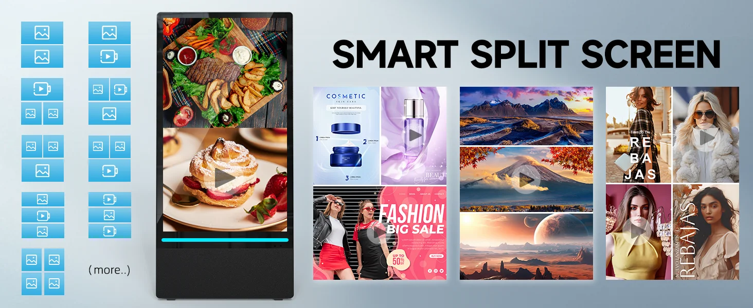 ⬛【Flexible multimedia playback】support split-screen playback of advertisements, playback via USB flash drive plug-and-play, WiFi or wired connection, allowing you to easily manage and display a variety of advertising content to enhance the effectiveness of advertising.