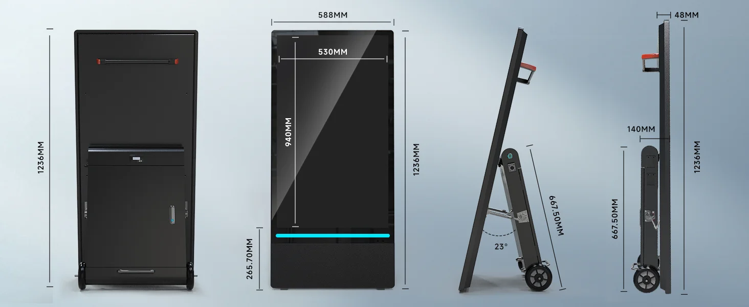 ⬛【Omni-directional protection】 43-inch portable advertising machine with IP55 waterproof, dustproof, anti-theft (wheel limit lock) function, high temperature resistance, to ensure stable operation in a variety of environments, so you do not need to worry about the weather changes or security risks affecting the use of equipment.