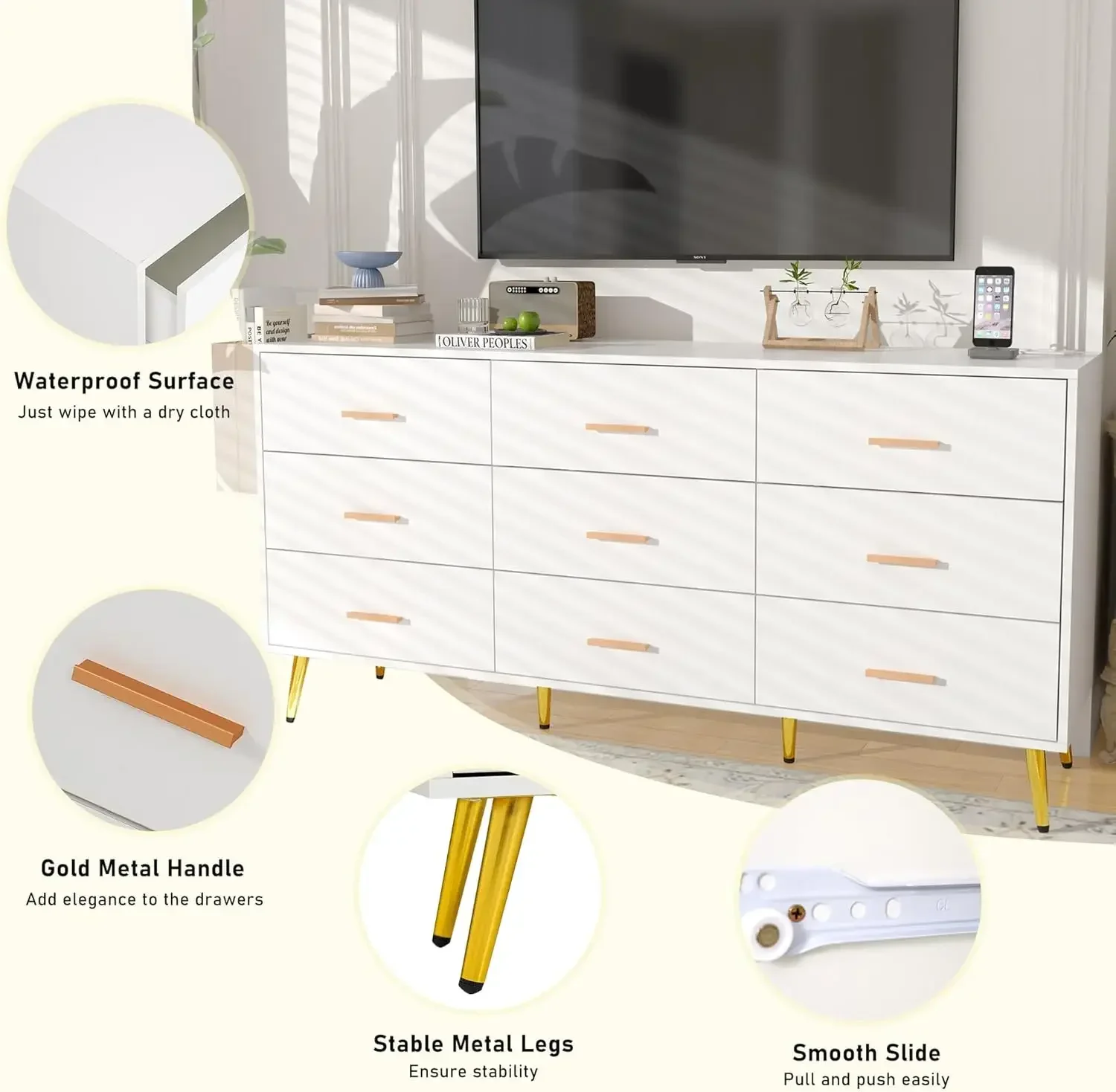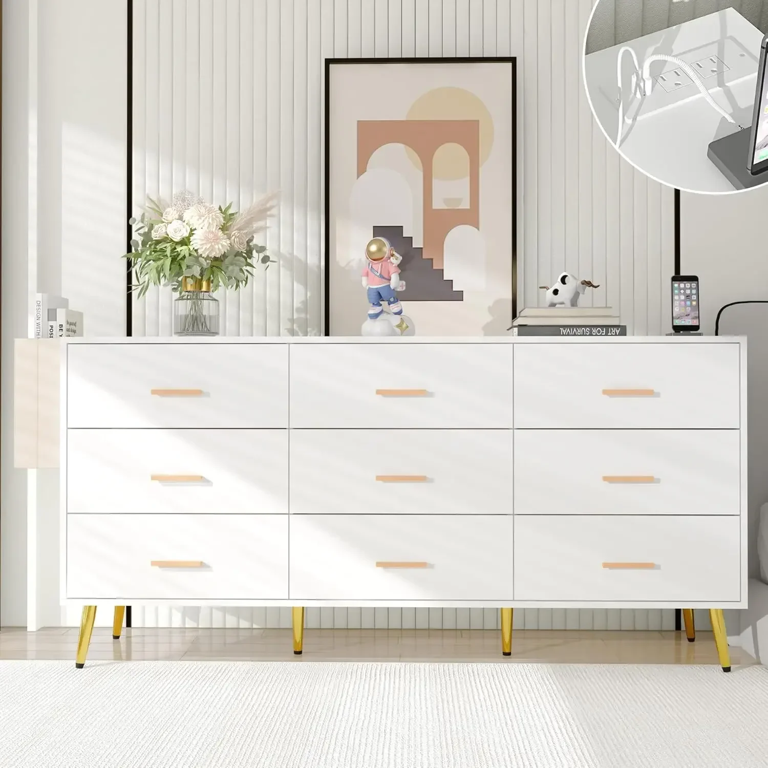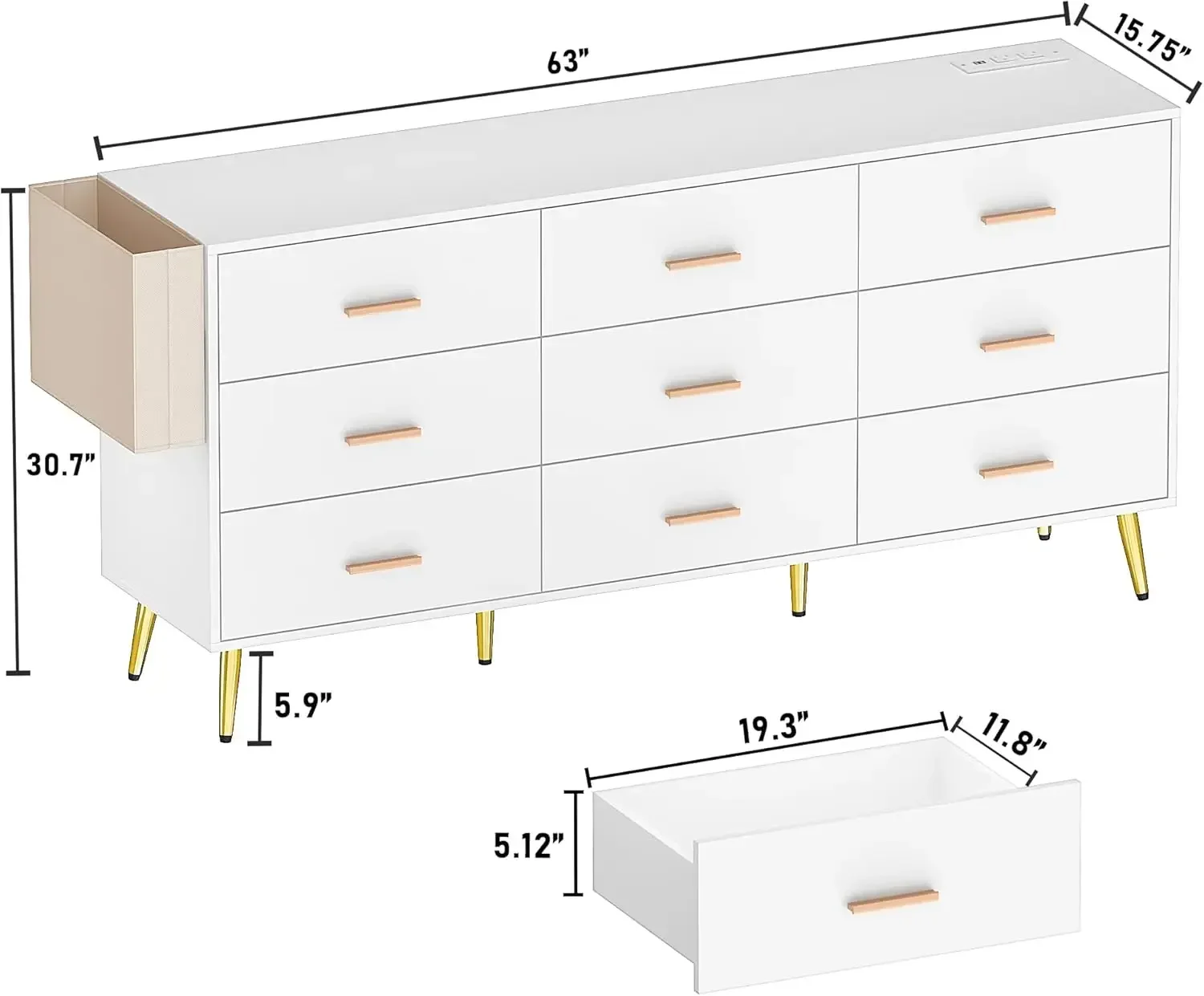 9 Drawer Dresser for Bedroom, 63" Long Dresser with Charging Station, Modern Chest of Wide Drawers with Gold Handles & Storage Pocket, Wood Dresser for Kids Bedroom, Hallway, White