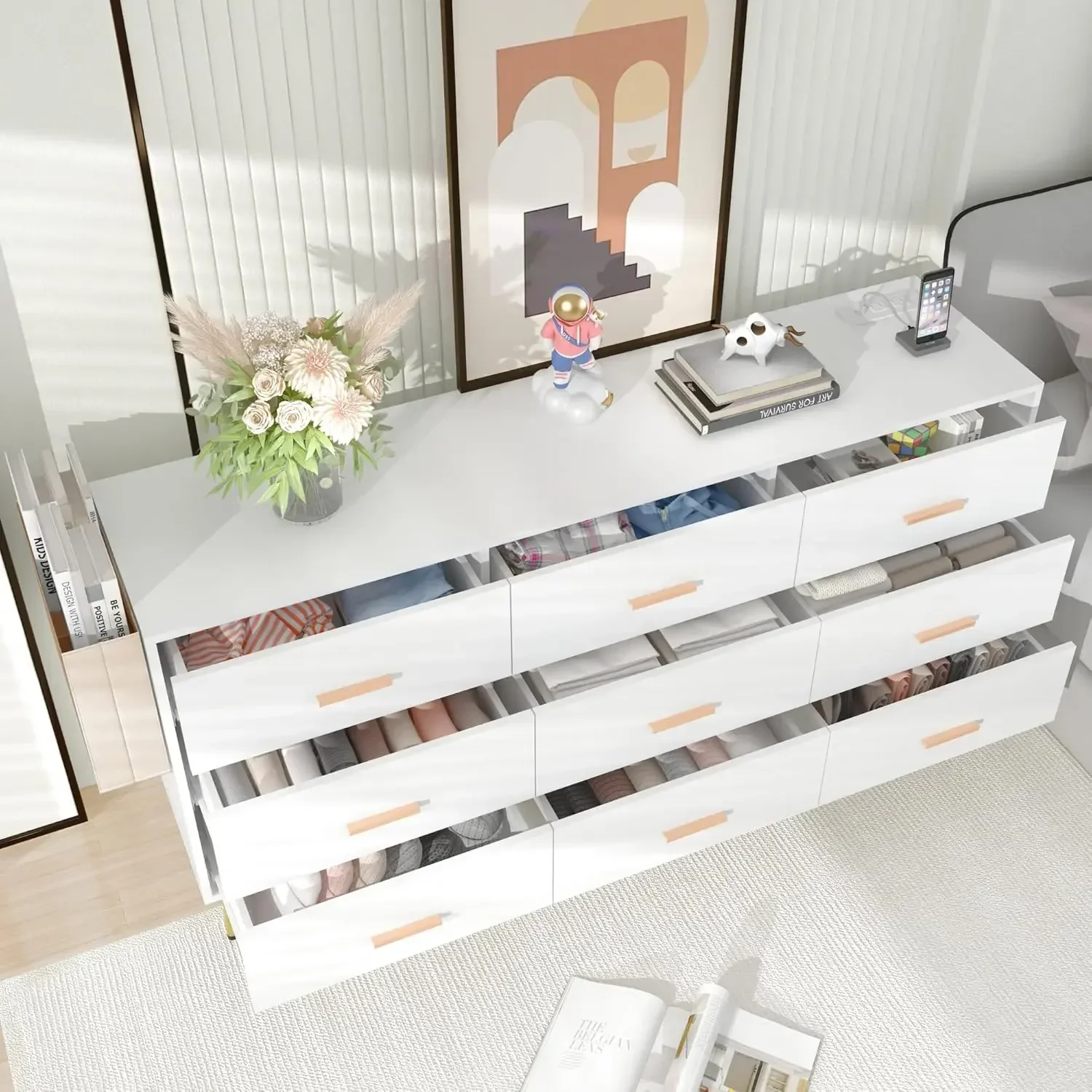 9 Drawer Dresser for Bedroom, 63” Long Dresser with Charging Station, Modern Chest of Wide Drawers , White