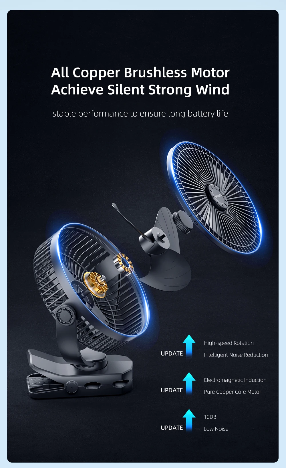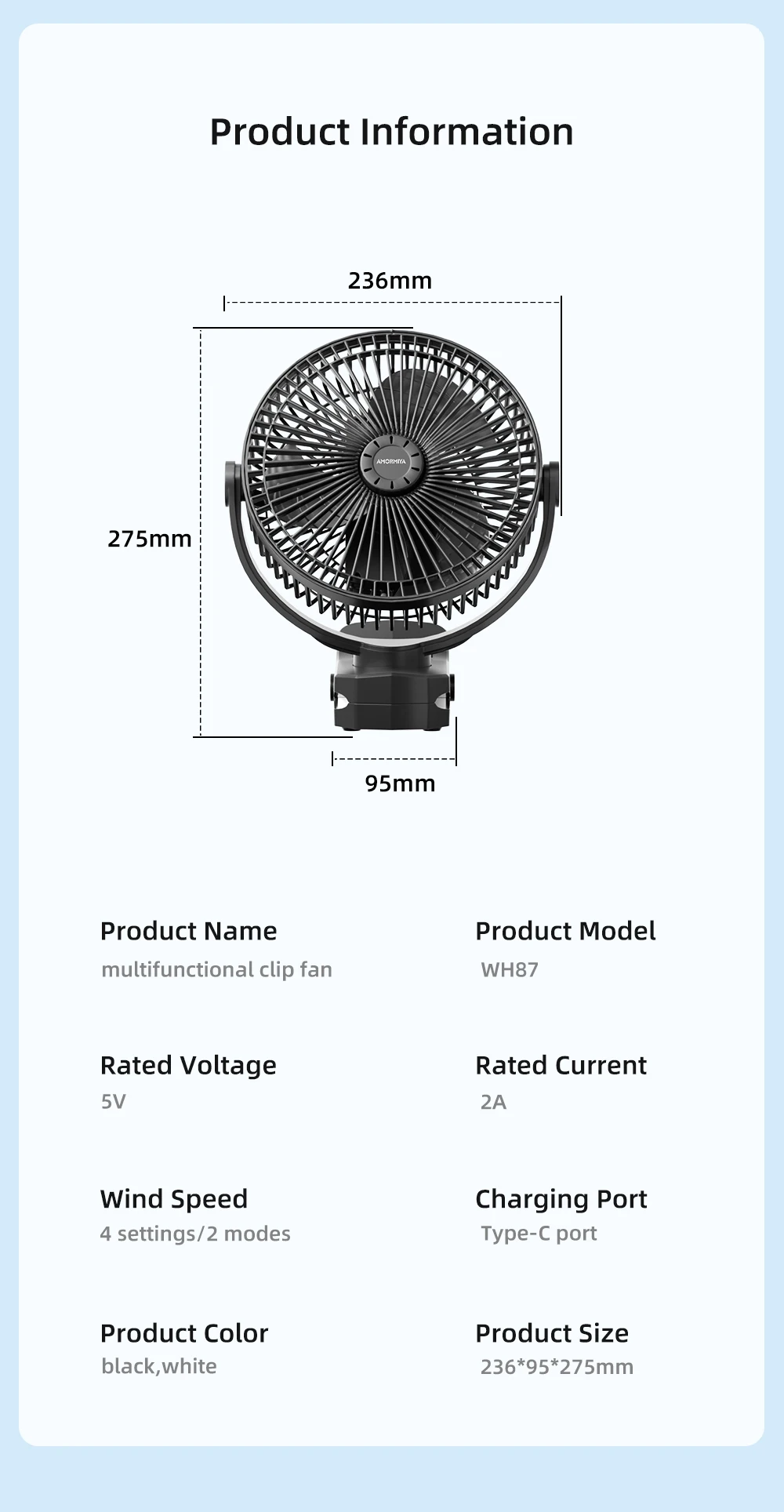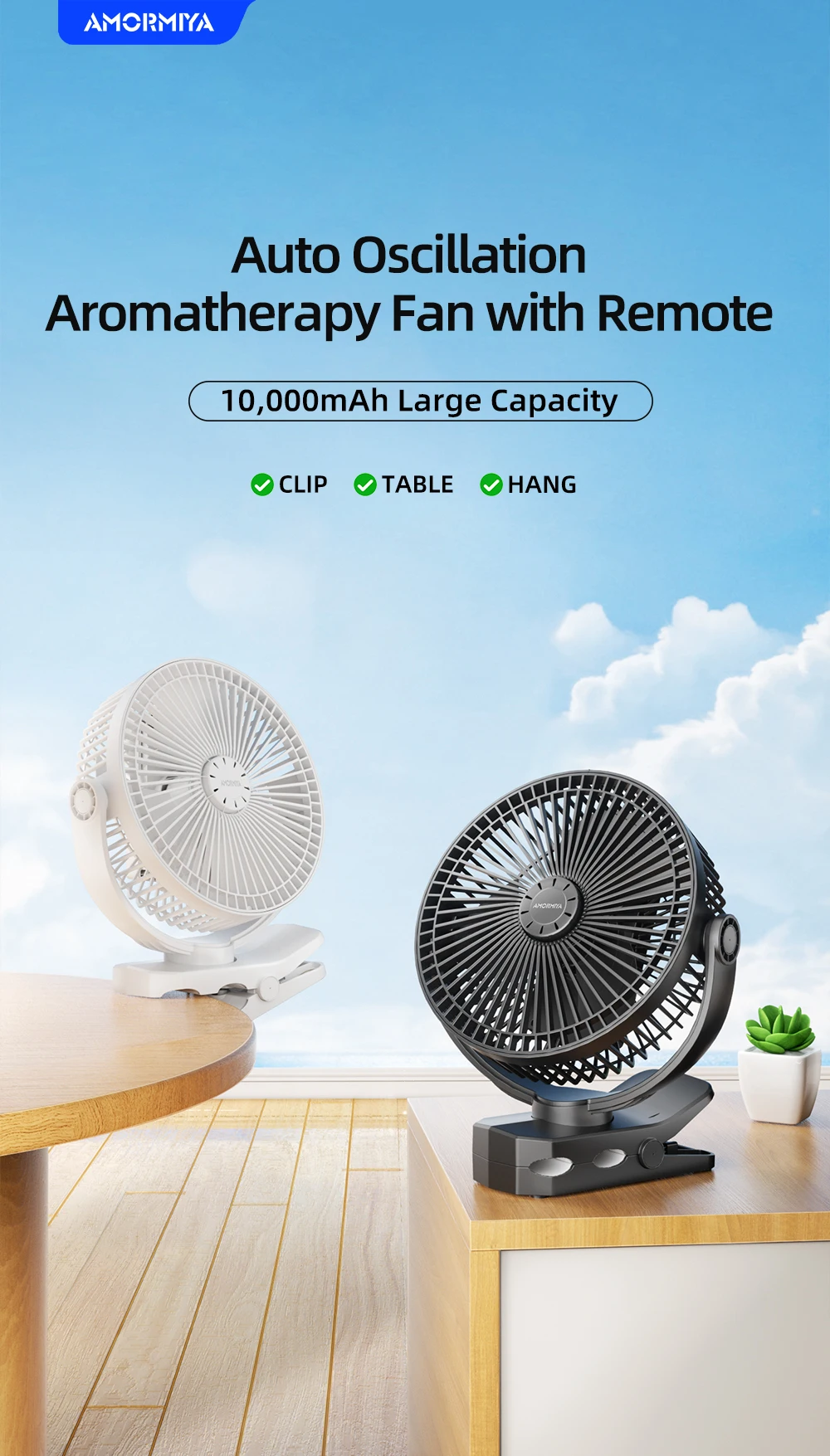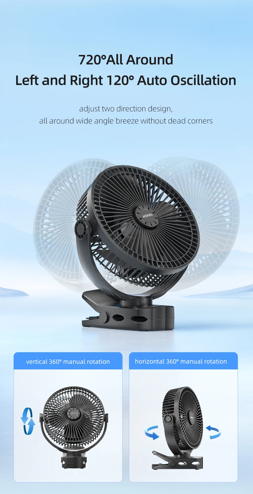 AMORMIYA Rechargeable Mini Clip Electric Fan 180°Auto Oscillation USB