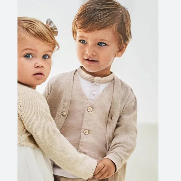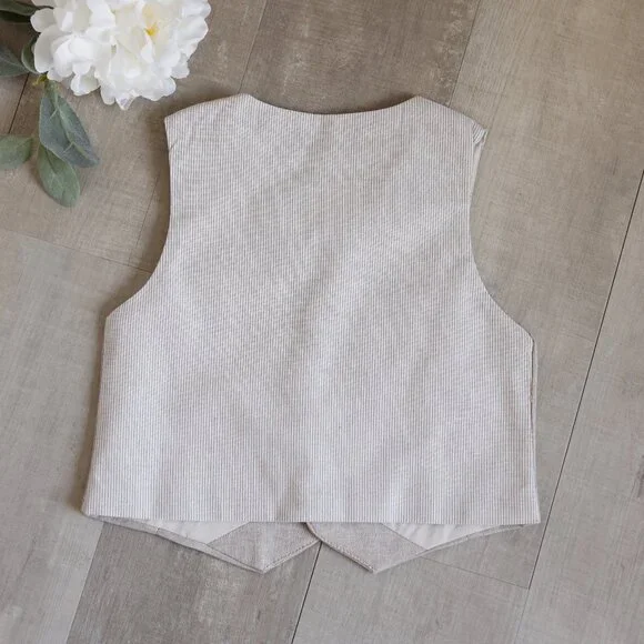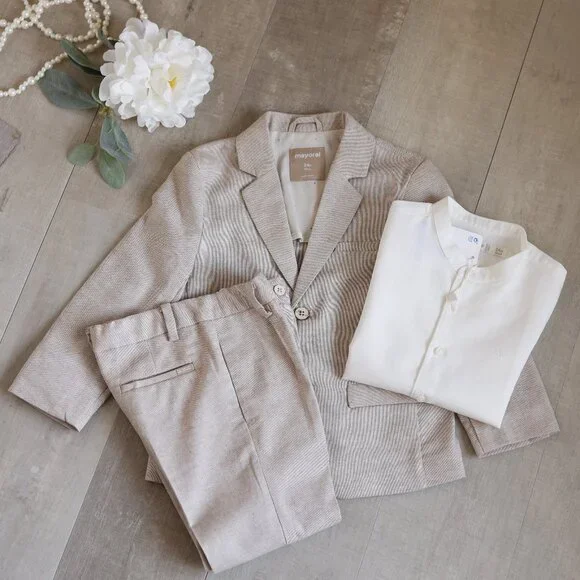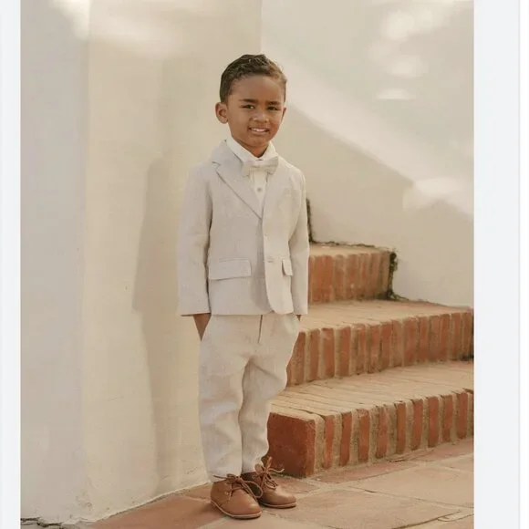 This little boy's Linen Vest (Waist coat) is the perfect addition to every little boys wardrobe. The three-button closure vest is done in a classic Beige/Flax hue is made of 88% Cotton, 12% Linen (all natural fabric). Three faux wooden buttons are the perfect accent to the beautiful linen.A single dart on each side of the front gives a tailored look/fit. Vest is fully lined with a coordinating dot print cotton. The back of the vest is done in a Hairline Stripe for contrast and stylish look.Pair with a white or ivory linen button-up shirt and linen pants with brown loafers and your "Little Man" is set for any dressy or dressy- casual event/occasion or add a linen Blazer for extra Special Occasions (Shown in last images, but NOT INCLUDED-see other listings to bundle) Perfect for Beach Weddings, Ring Bearers or vacation dinners. Precious with Jeans and Nubuck oxfords or Loafers also!!!!New With Tags** also pair with striped linen Beige Flax suit separates that I have listed-matches perfectly!!!Size 24 Months (fits 24 Months/2T-see measurements for fit)12 across chest (underarm to underarm)12.25"from top of shoulder to sleeve hem (13.25 to point)Size 36 Months (fits 36 Months/3T-see measurements for fit)12.5 across chest (underarm to underarm)12.75" from top of shoulder to sleeve hem ( 13.75" to point)