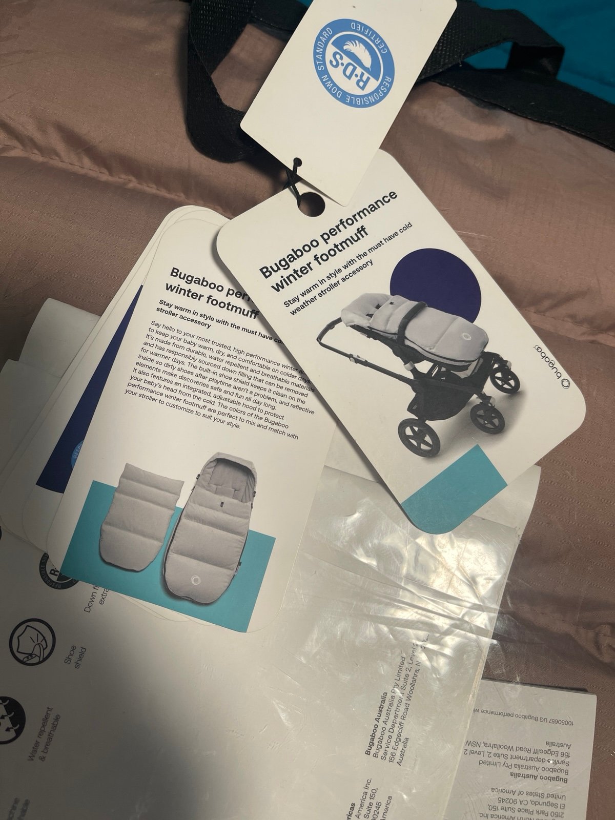 New never used bugaboo performance winter Footmuff. The color is dune pink. Comes as shown in the photos. Selling for a friend. There is very little pet hair on the outside packaging but not the item itself. Ask any and all questions. No returns. Originally paid about $220 for this.