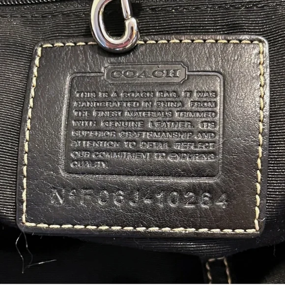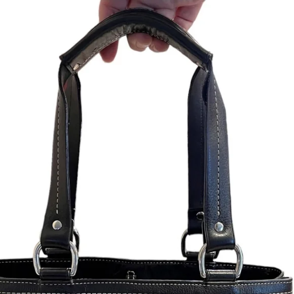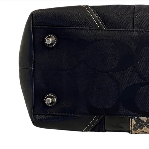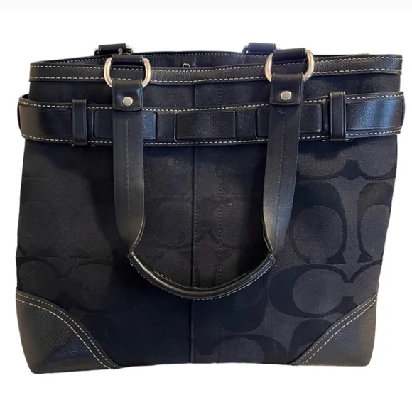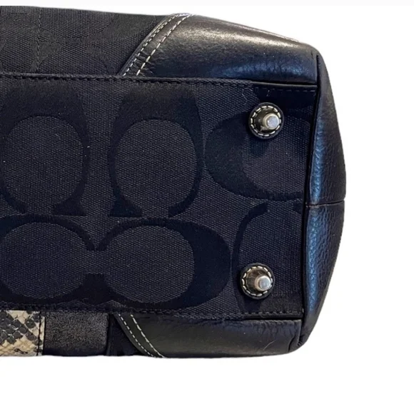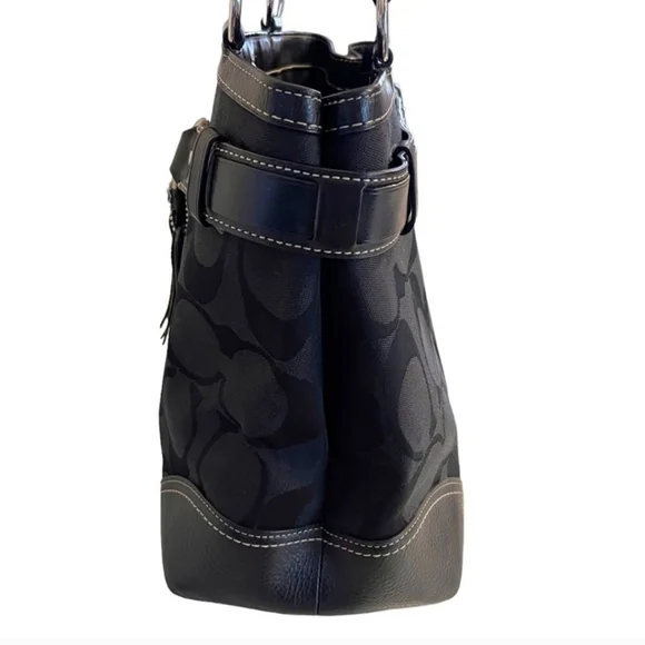 Black Signature Patterned Canvas Fabric with Leather Handles, Corners and Trim...Double handlesnside zip pocket plus two other slip pockets. Amazing HandlesLined in black fabricFooted bottom.....Tassels... Inside the bottom on one side does have a small white stain. Silver metal clasp and accents.... EUC💥 Cute unique bag! 💥