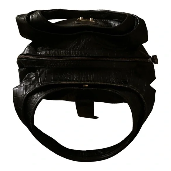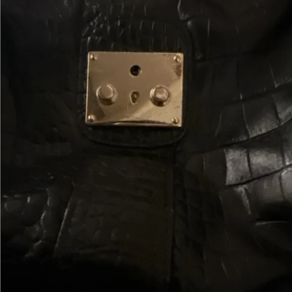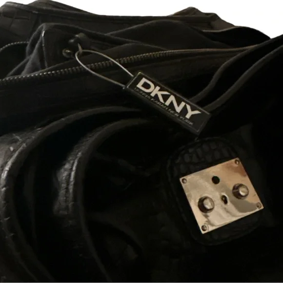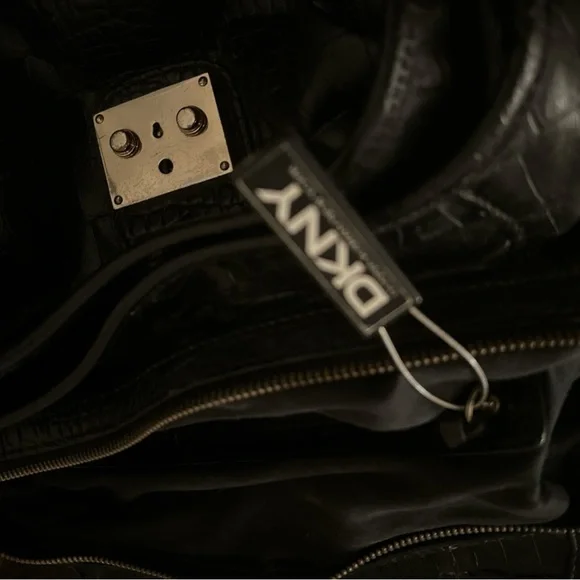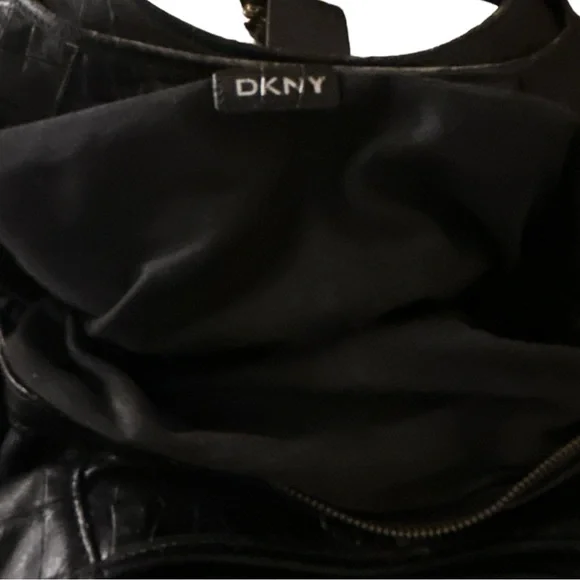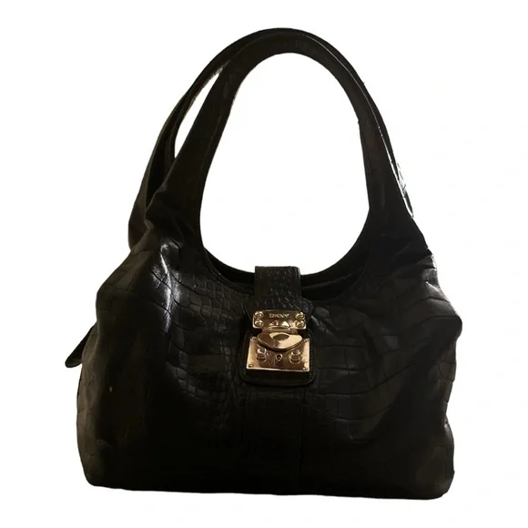 EUC | excellent used conditionDKNY Leather Ted Crocodile 🐊 Embossed Medium Shoulder Bag with Gold Tone Hardwares, Push-Lock Closure, Middle Top Zipper Closure, Size Pockets with Zipper Closure *inside lining has some discoloration as shown in photos, shows signs of slight wear, but overall - great condition and well cared for
