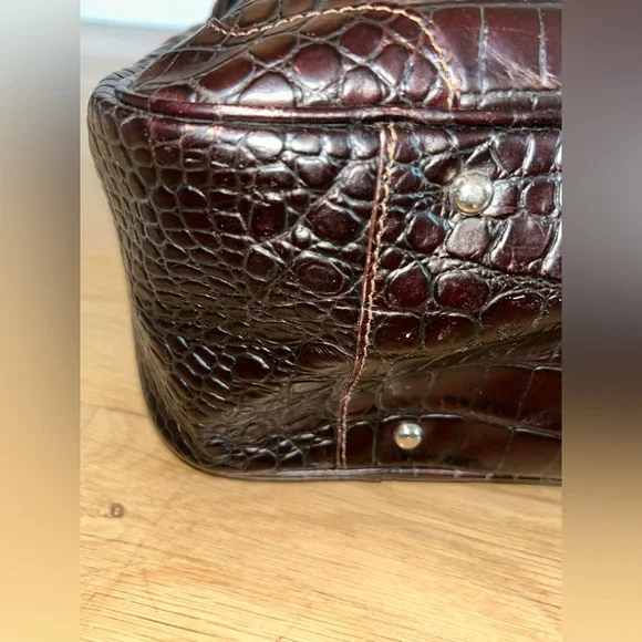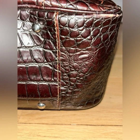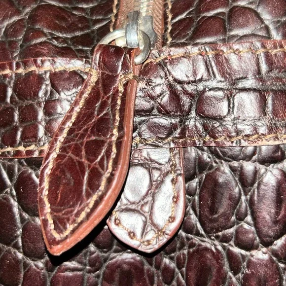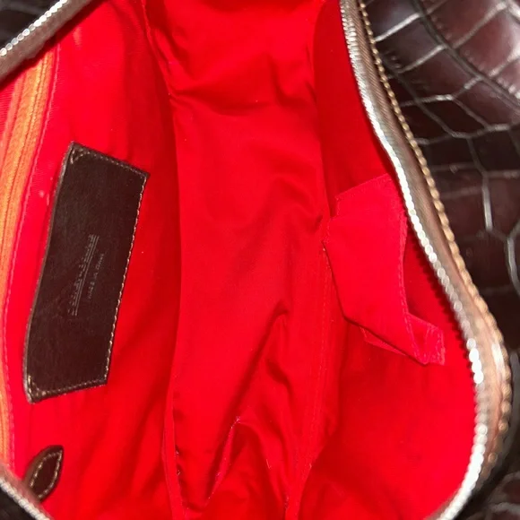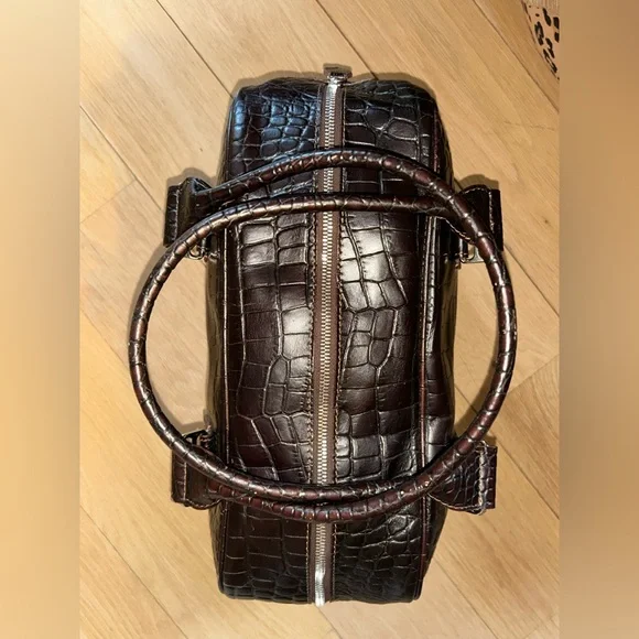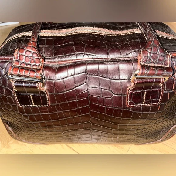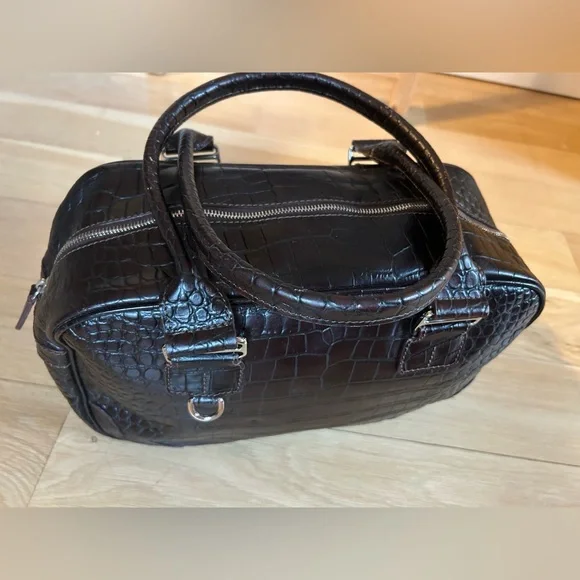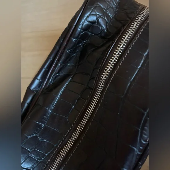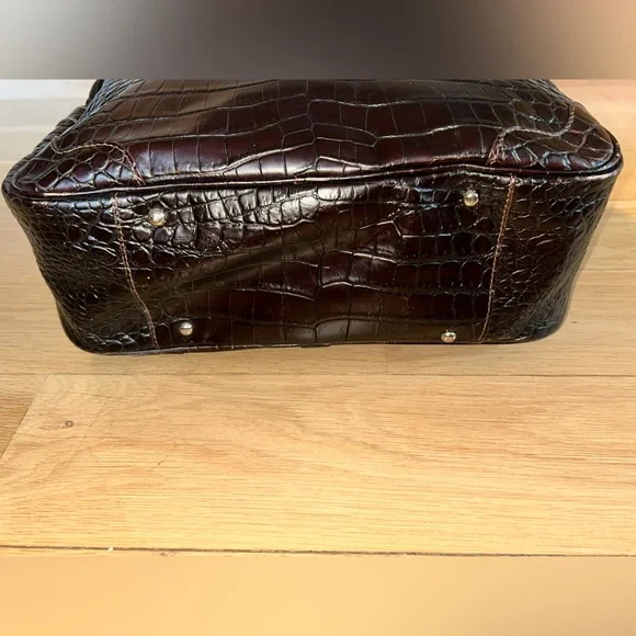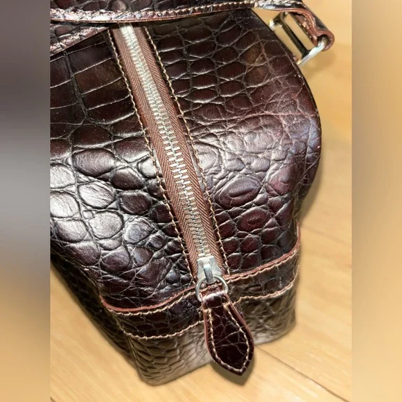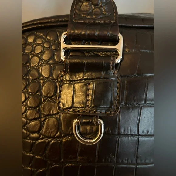 DOONEY & BOURKE Vintage Deep Brown Crocodile-Embossed Bag with Silver Tone Hardware This classic bag features a sophisticated crocodile-embossed leather in rich brown with mid:rise handles for hand, arm or shoulder carriage.Internal side zipper pocket, phone pocket and logo embossed leather metro or credit card slot.Made in Italy Condition: Excellent Vintage Condition of bag body, interior, hardware and handles