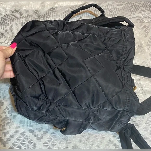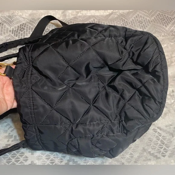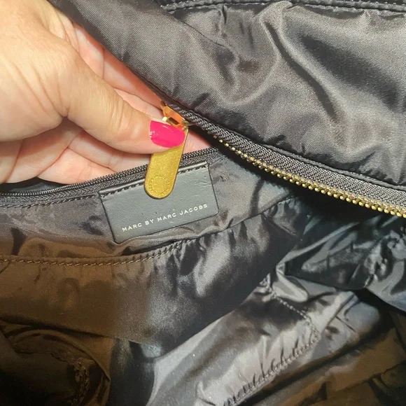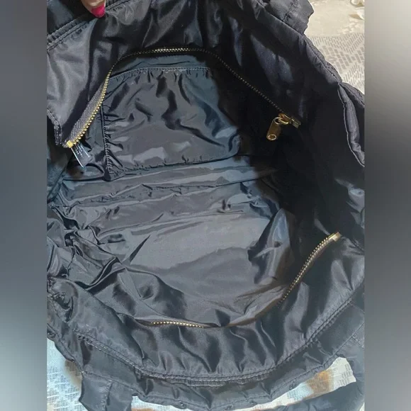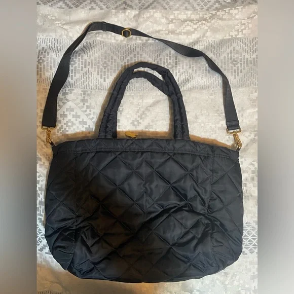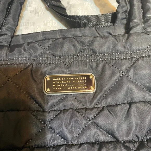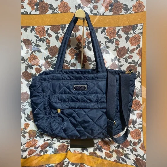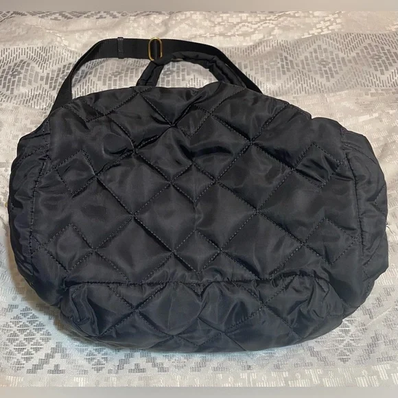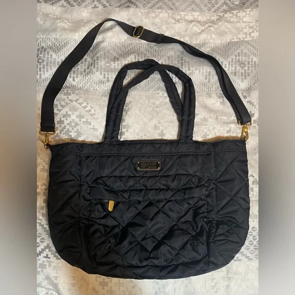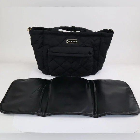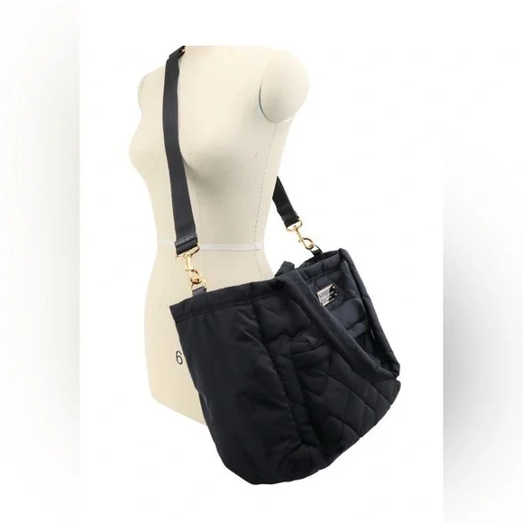 Stylish and versatile black quilted bag / tote perfect for any occasion. Features a sleek design with durable straps.Quilted baby bag with logo hardware on the front.Top zip closurePolyurethane, terylene, and PVC trimGoldtone hardwareOne outside zip pocketOne inside zip pocketOne inside slip pocketTwo inside open pocketsLinedPolyesterImportedSIZEDouble top handles, 8.5" dropAdjustable, removable crossbody strap, 15" to 28" drop14"W x 11"H x 7"D**Minimal wear, please see pictures