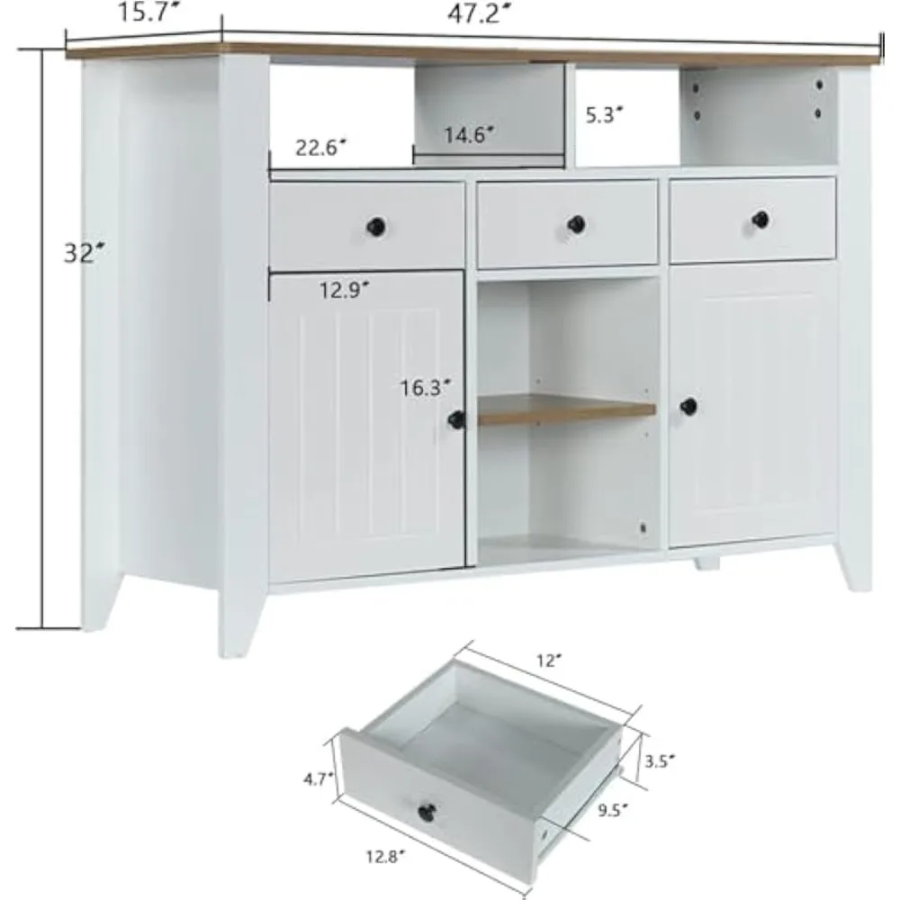 Farmhouse Coffee Bar Cabinet with Storage, 47 Inch Coffee Bar with 3 Drawers & 2 Doors, White Buffet Cabinet with Open Shelf,