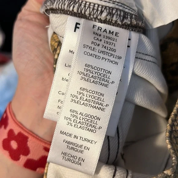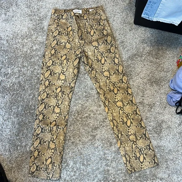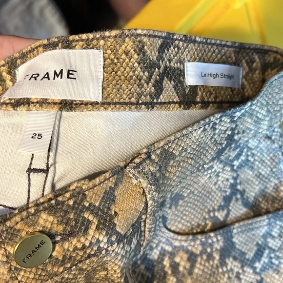 FRAME's Le High jeans get an update in an of-the-moment python print. With the perfect high-rise, straight-leg fit they look equally chic with sneakers and stilettos.High-riseStraight-leg silhouetteStretch denimMATERIAL & CARE68% cotton/19% TENCEL® lyocell/10% elasterell/3% elastaneDry clean PLEASE Use CODE: POSHINFORREST at sign-up for $10 off your first purchase!*ALL packaging of orders are recorded & photographed *I love offers what I love even more are bundle offers because I accept ALL reasonable offers*All items purchased have been washed by me personally *All measurements are approximate to the best of my ability *If you have questions ask*I do not cancel orders to accidental purchases*Remember all stock photos used might have different lighting so I try my best to make sure you know exactly what you are getting *If there are any imperfections I will state it in here in the description*ALL orders will come with a dryer sheet in package starting June 1, 2024 if you do not want this please let me know within an hour of purchase *I Do Everything To Protect My Items While In Transit Please Note Climate Change Is Out Of My Control*Comes from smoke free & pet friendly home*Ships in less than 24 hours!