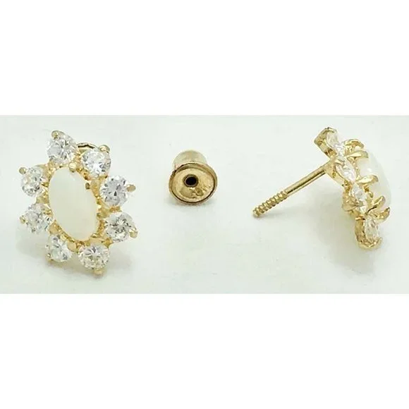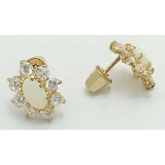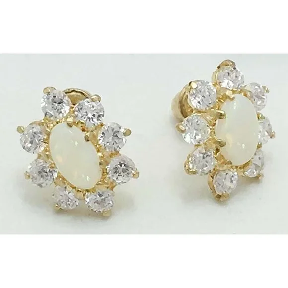 Metal purity: 14k Yellow GoldCondition: New with tagGemstone Type:2 genuine opalTotal Ct weight : 0.48 caratsOpal grades:Hue . . . white multi colorTone . . . medium Saturation . . . vividCut . . . excellentNo inclusions or flawsCreated white sapphires surroundedDimensions: 5 mm x 3 mm main gemstone measurements9 x 7 mm each earring measurements