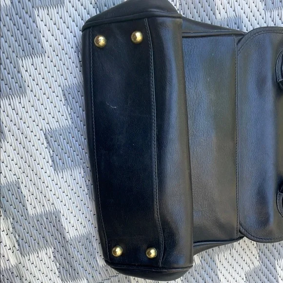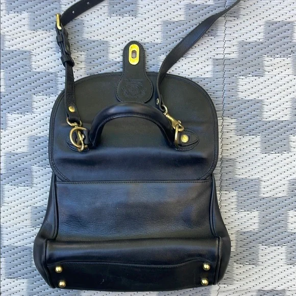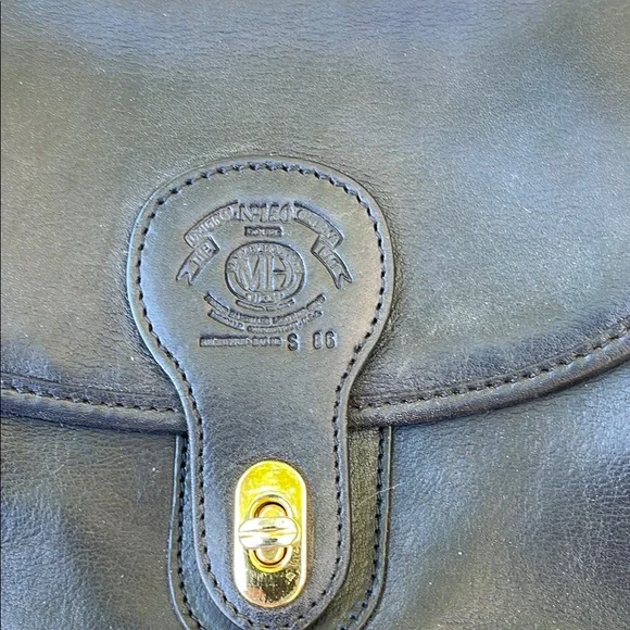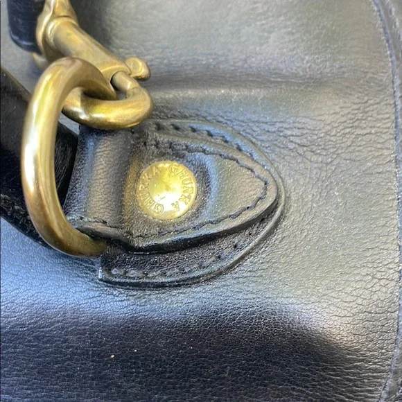 This Ghurka satchel features a sleek black leather exterior with gold-tone accents, offering a sophisticated and timeless look. Its structured design includes a flap-over closure and an adjustable shoulder strap, making it perfect for both casual and business settings. The bag's classic silhouette and practical top-handle design ensure it remains a versatile accessory for everyday use.