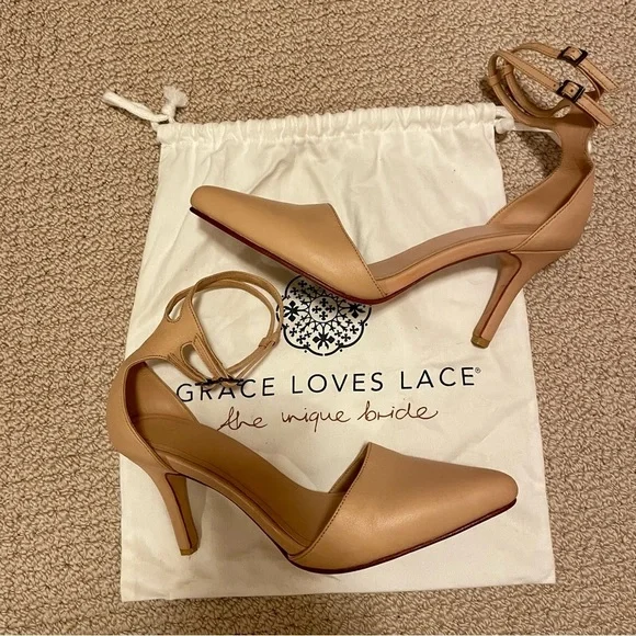 Grace Loves Lace Tan Leather “Honor” Occassionwear Ankle Strap Pointed Almond Toe Heels in Sand 39/8.5. Timeless, elegant, and just a hint of boho, these heels are perfect for the unique, modern bride. Feature a comfortable stretch leather, moderate heel height, and chic buckle ankle strap. Discontinued stylePreloved, worn once. One of the heel caps is chipped as shown.
