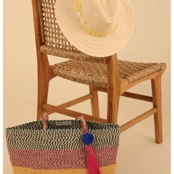 This vibrant Hale Bob tote bag features a striking combination of mustard, pink, and black and white patterns, perfect for adding a pop of color to any outfit. Crafted with a woven textile material, it boasts a casual bohemian style and is adorned with playful tassels in bright pink and blue. Its sturdy construction makes it ideal for everyday use, whether you're heading to the beach or running errands.