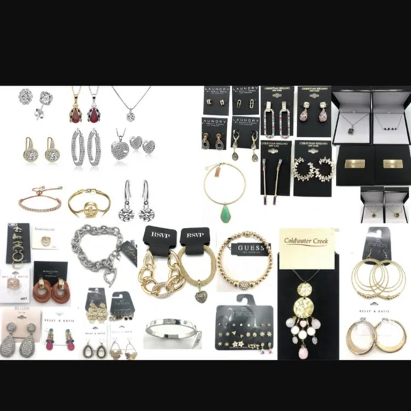 100% All designer & Name Brands, Tons of Assorted styles !!Priced Below Wholesale !You will receive all these Designer and Name Brands below. The photos show some of the styles you will receive among other comparable pieces based on AvailabilityNecklaces, Bracelets & EarringsMacy's ,Nordstrom ,Chico's Erica Lyons Charming Charlie, Mix it, Bold Elements By JC-Penny , Rachel Roy, Halogen,ect..23to 27pieces per boxAll new -All individually packaged ( not store returns) most have prices. Some do not.
