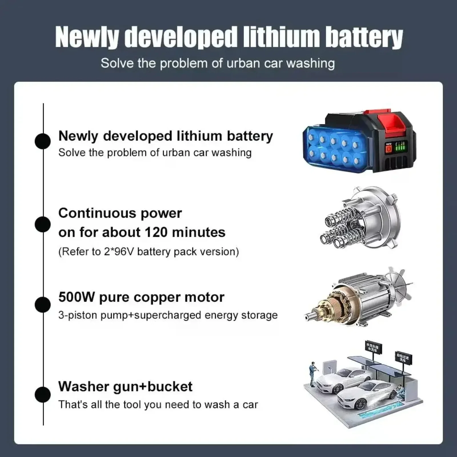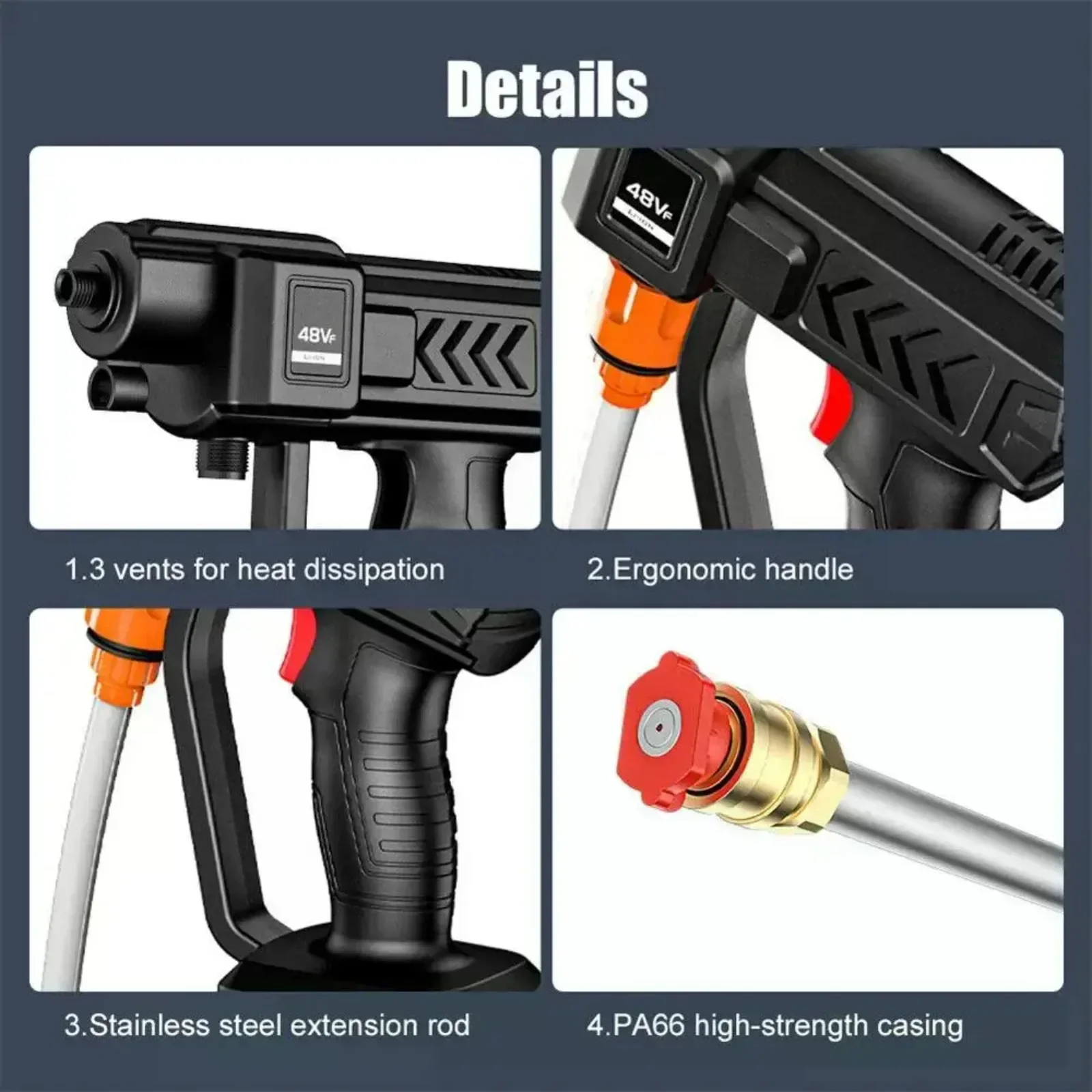 1. Considering portability and convenience, the wireless high pressure washer no longer requires a power cord and is powerded by a large battery capacity, going you to clean all outdoor Spaces and equipment places any time and any.