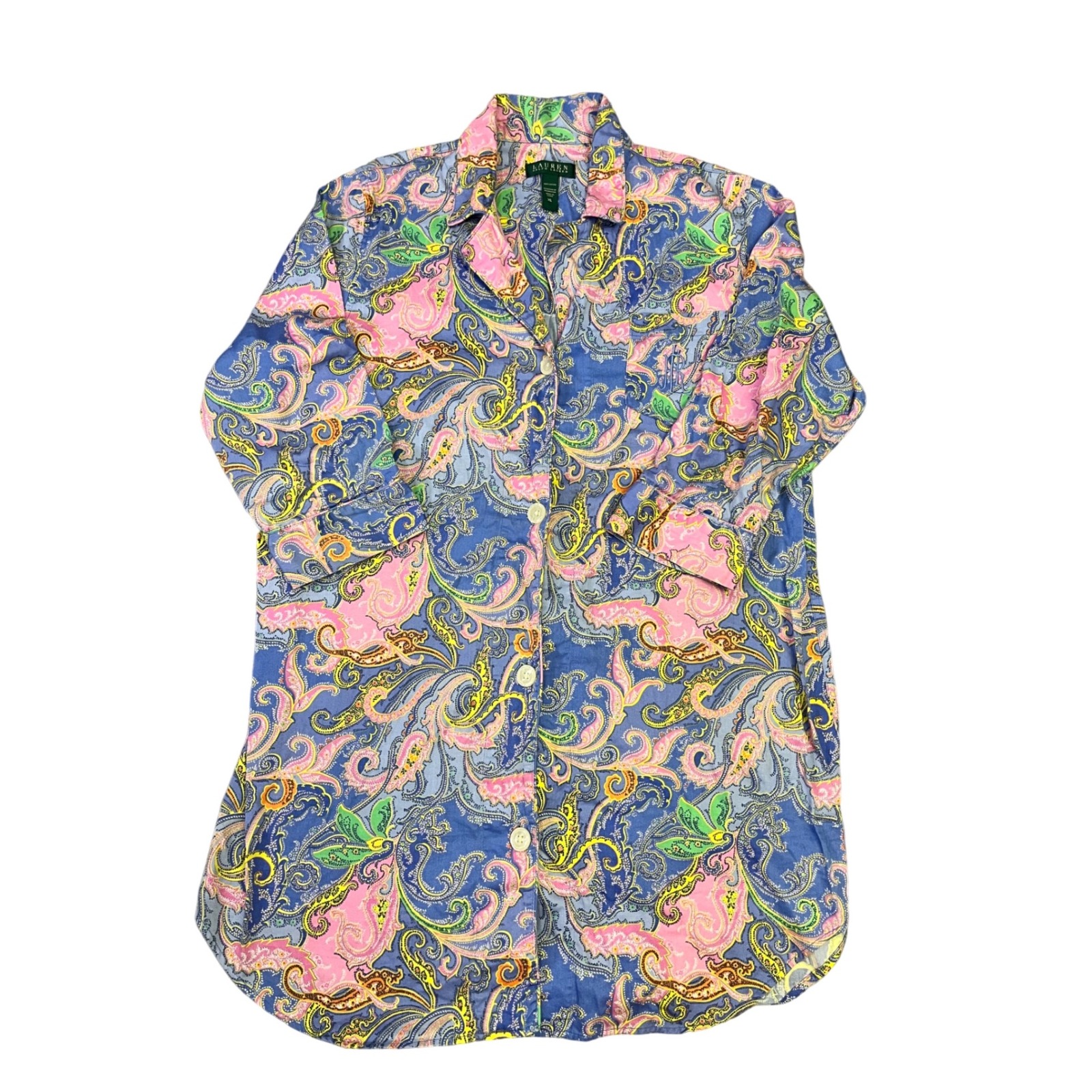 Striking pajama top by Lauren Ralph Lauren, a standout piece featuring a vibrant and intricate paisley print. This long-sleeved, button-down top is made of 100% cotton and is exclusive of decorations. The design showcases a rich blend of blue, pink, yellow, and green hues, creating a visually appealing and luxurious aesthetic. Complete with a front pocket adorned with an embroidered 'LRL' monogram, this top offers both style and practicality.