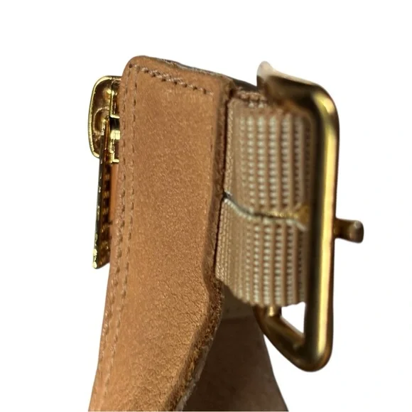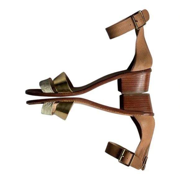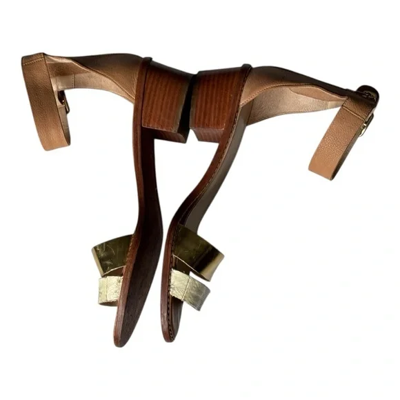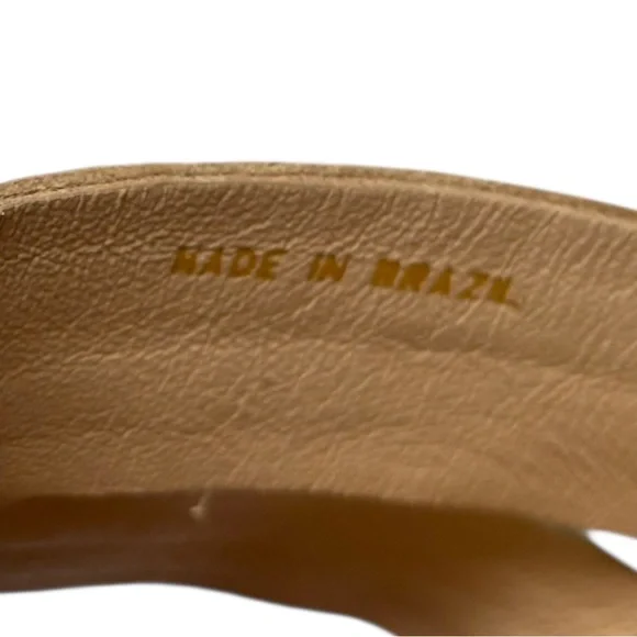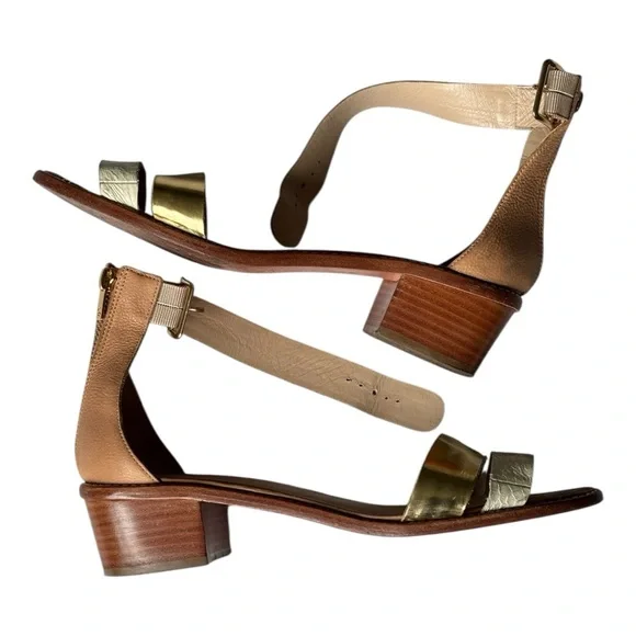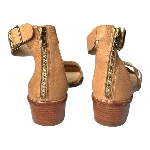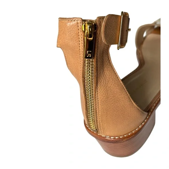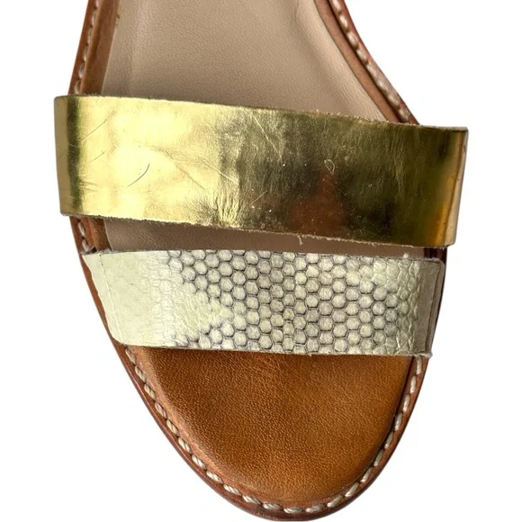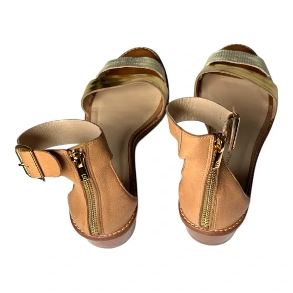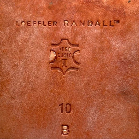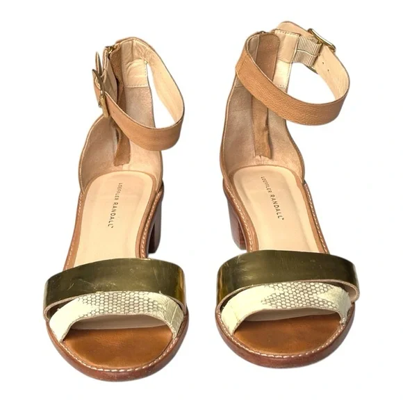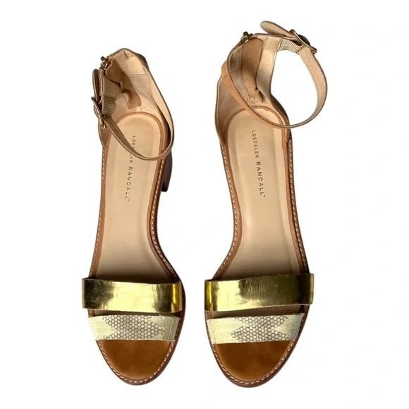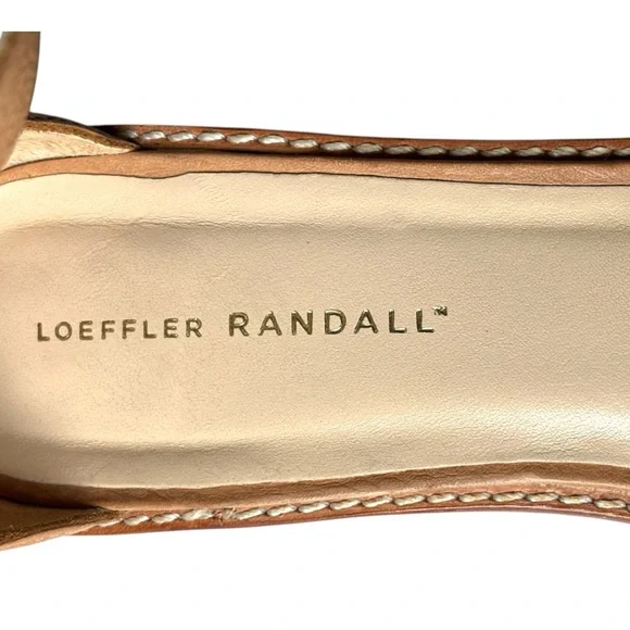 Loeffler Randall Leather Sandal with a low block stacked heel for stability and wraparound adjustable straps. The shoe features gold accents/vamp strap as well as a smaller animal print vamp strap.•the shaft is 4.5” from the bottom of your foot. •2” base/heel•zip back at shaft •adjustable wraparound ankle strap•tan leather •gold colored accents •leather uppers and soles •used in good condition with some normal wear on the strap and soles.Everything works well.