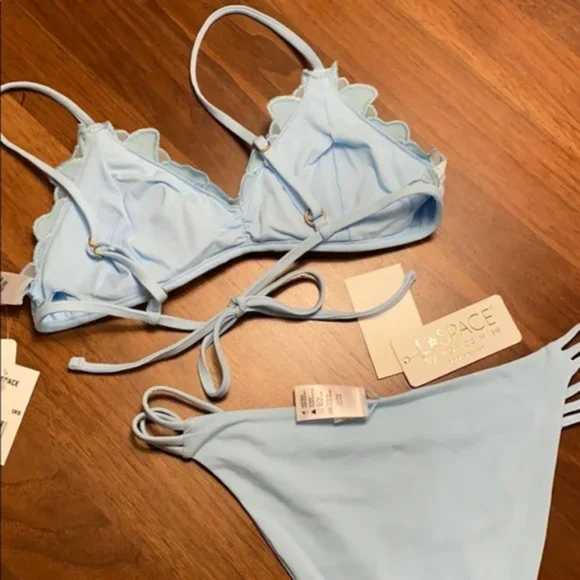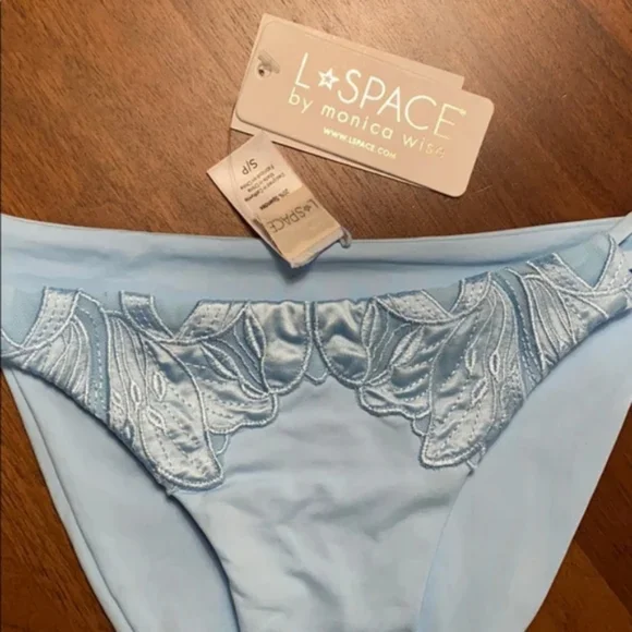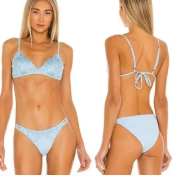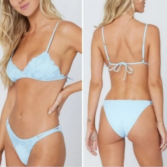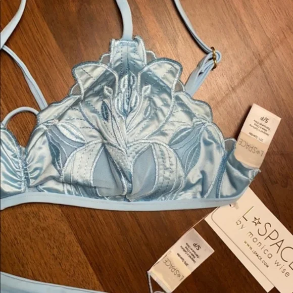 New with tags. Perfect condition. No trades.Top has removable padding, adjustable straps, and ties in the back. Satin and floral applique. Sky Blue.Inspired by delicate lace intimates. Sold out at Anthropologie.Both pieces size S. I have other sizes available in my other listings.Check out my other swimwear from Onia, WeWoreWhat, Billabong, and Vitamin A. Bundle and save!