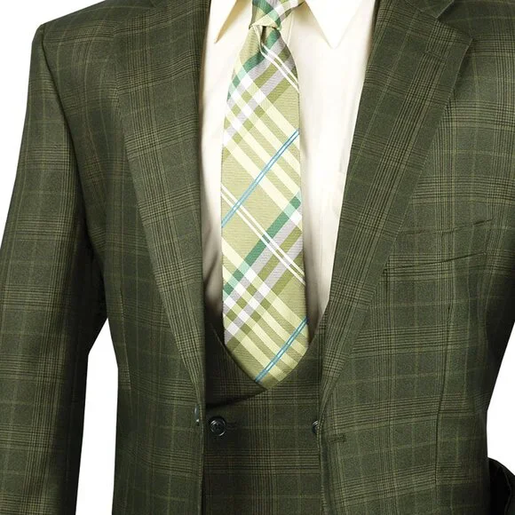 This is a sharp looking, all-seasons luxurious wool feel men's glen plaid suit that any man would look great in! Comes with a pair of socks.• Fully lined• Imported• Notch lapel• Low cut vest• Side vents• Two front flap pockets, left chest welt pocket• Two-button closure, 3-picec suit with low cut vest; four-button cuffs• Suit includes fully lined jacket and flat front, partially lined pants with unfinished hemSize & Fit• Jacket sizing is indicated by a number and a letter; Number refers to chest size, Letter refers to length of jacket based upon height: S=5'7" and under; R=5'8"-5'11"; L=6' and up• Regular fitMaterials & Care• Dry clean• Shell: polyester/rayon; lining: polyester