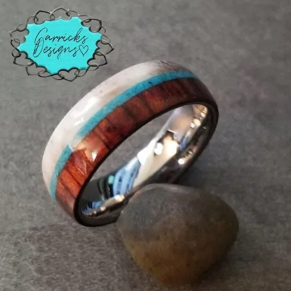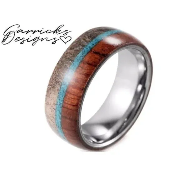 Men's Real Tungsten Wedding Ring With Deer Antler, Turquoise, and Whiskey Barrel Wood OnlaysThis is real Tungsten with a polished finish.The outer band has a turquoise onlay with whiskey barrel wood on one side and deer antler on the opposite side.Every ring will have unique patterns as natural materials are never the same.This ring is heavy and not light-weight like some of the fake Tungsten rings some people Sell.Will not tarnish or turn your finger green.Available in sizes -8mm - 9, 10, 11 or 12Includes a black ring box.High quality and affordable.