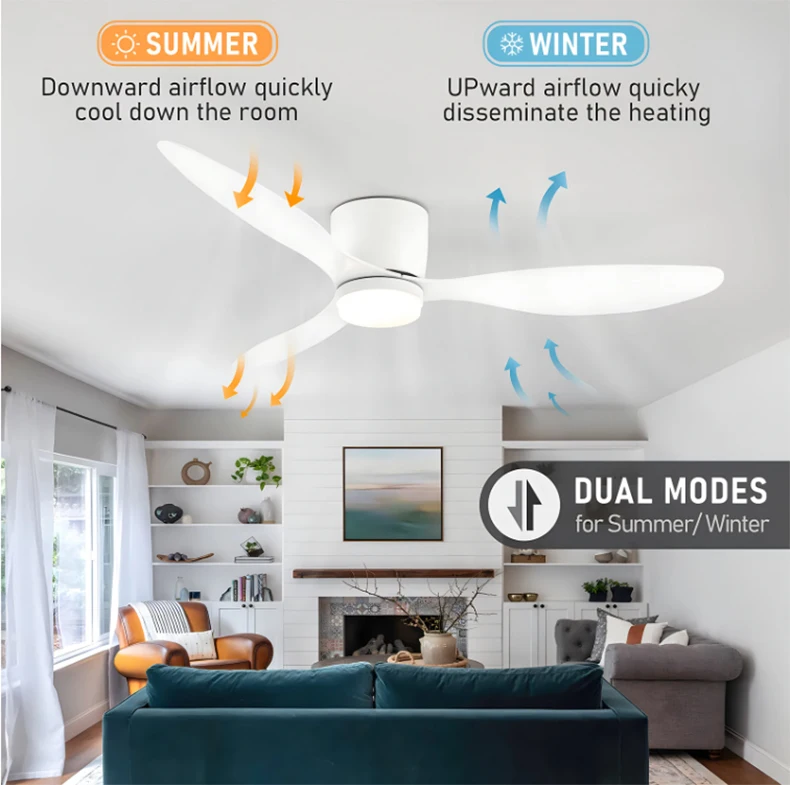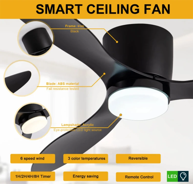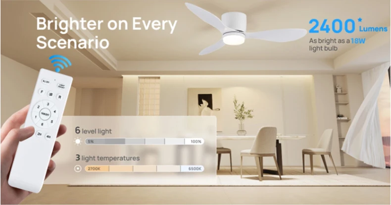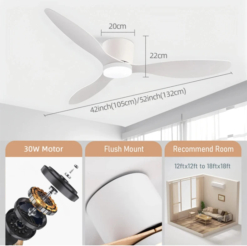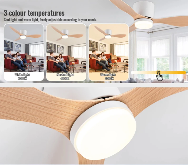 This ceiling fan with light from us comes with high quality LED lights that offer 3 warm colour temperatures to meet your different lighting needs. It also has 6 levels of wind speed adjustment, which brings you a comfortable experience whether it's a hot summer day or a cool spring or autumn day. What's better, it adopts a silent DC motor for smooth and silent operation, making your home environment more peaceful. In addition, it is equipped with a remote control for easy operation and wide range of applications, making it an ideal choice for your home life!