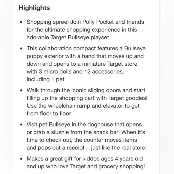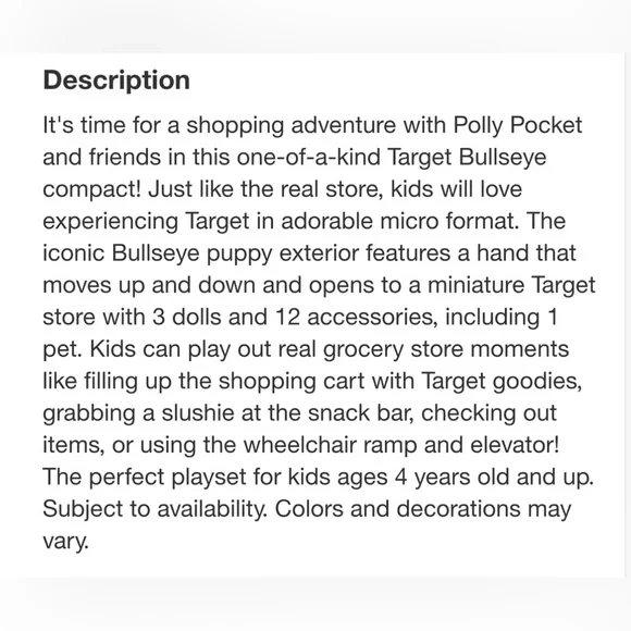 POLLY POCKET xTARGET BULLSEYE ADVENTURE PLAYSET BRAND NEW IN PACKAGING - SEALED NUMBER OF PIECES:16 DIMENSIONS:11.5 H x7.5” W x 2” D .64 POUNDS ‼️ SUGGESTED AGE :4 YEARS AND UP🎯THIS TOY CONTAINS SMALL PARTS ADULT SUPERVISION RECOMMENDED FOR YOUNG CHILDREN 🎯🎯🎯MATERIAL : PLASTICANY QUESTIONS DROP BELOW FAST SHIPPING TY