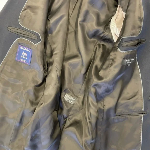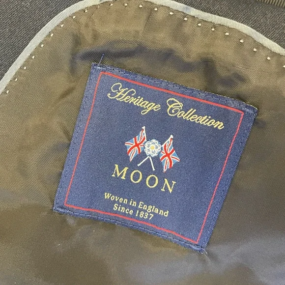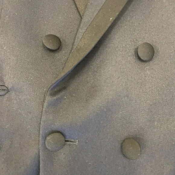 rag & boneDouble Breasted Two Tone Peak Lapel Dinner Jacket in English Wool by MOONGive the classic black tie look some up-to-date appeal. Or maybe try this with your favorite torn up jeans? Cut to a slim, well-defined fit, this handsome navy with black trim dinner jacket features a slightly curved covered peak lapel, a 4/2 button closer and jetted slit pockets.Size 44 R100% Wool- Double Breasted- Peak Lapel- Four-Two Closure- Double Vent Back- Lower Slit Pockets, Upper Welt-Single functioning button at cuffsColor Navy & BlackCondition Very Good to Excellent*one cuff button is missingApprox. shoulders 18 1/2” chest 44” length 30” sleeve 36” measured from center of collar sleeve 26 1/2” measured from shoulder seam2-8242.4x83