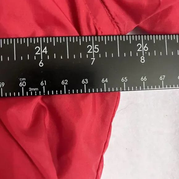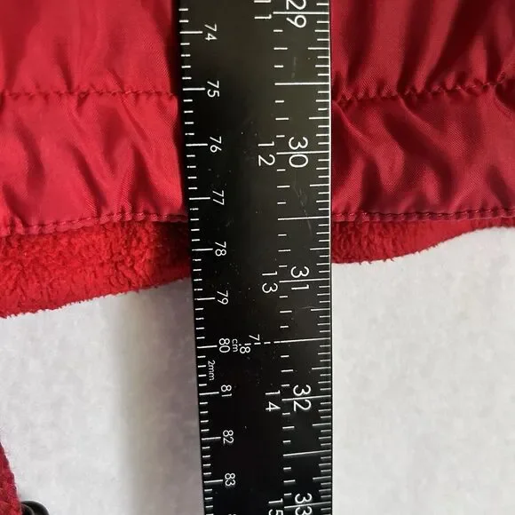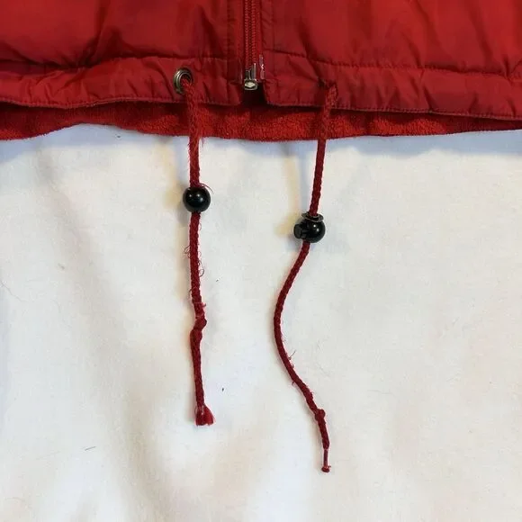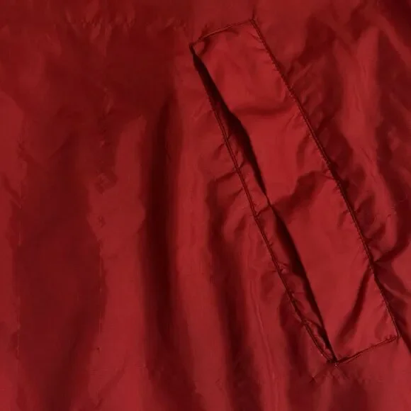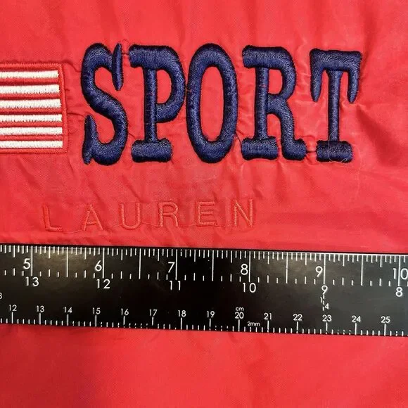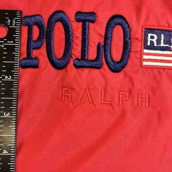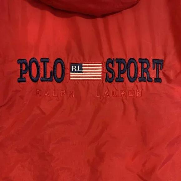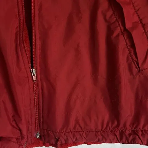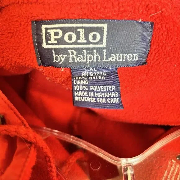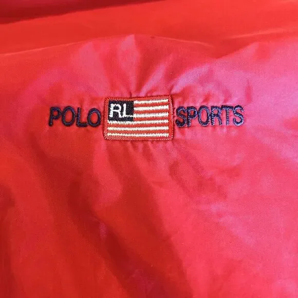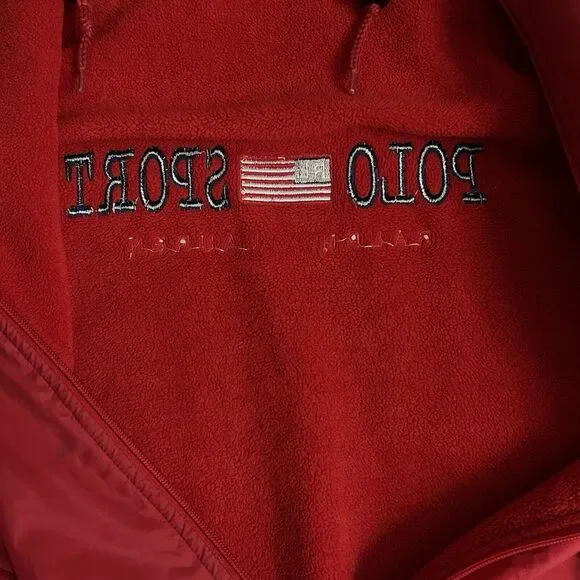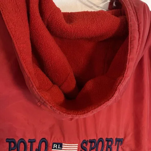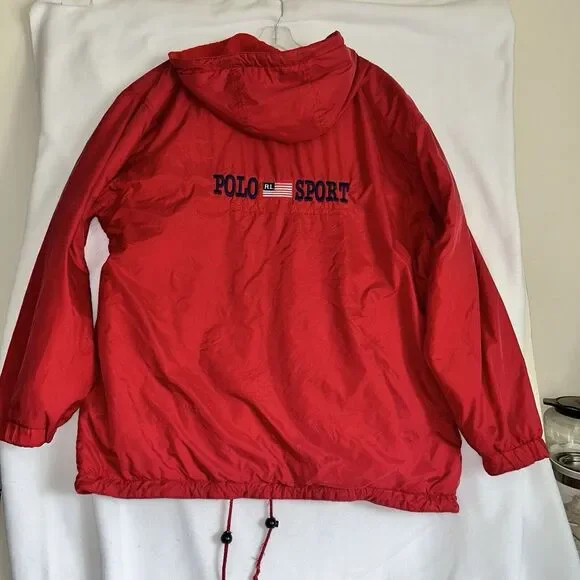 Ralph Lauren Polo Sport Full Zip Windbreaker Jacket Hoodie Mens Size XLSpell out front and Big Spell out on BackRed windbreaker exterior with red fleece liningPull toggle hoodie and hemPull tie on hem has loose Rivit on one side.Elastic cuffsFront slash pocketsFabric has some thread pulls from wear.Embroidery Polo Sport logo is a design standoutVintage Ralph Lauren Polo