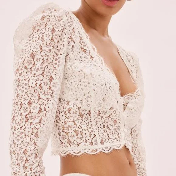 Overtly feminine in sheer scalloped lace, this simple and sweet top is too dreamy to cover up. Complete with a fitted silhouette, pretty puff sleeves and functional satin-covered buttons along the front.Body & Contrast: 81% Polyamide/19% Viscose; Lining: 97% Polyester/3% ElastaneMatching Mia BraBRA: SmallTOP: Medium$265 Total