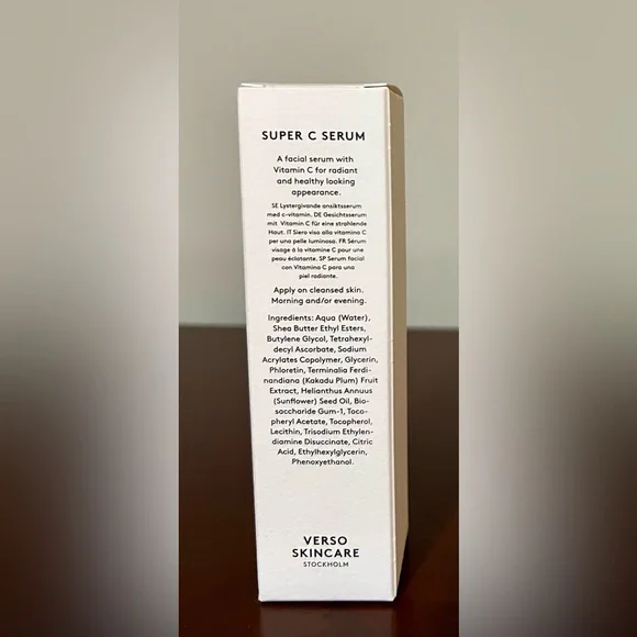 NEW. BOX NEVER OPENED. Verso Super C Serum 30mlPromoting a more even and luminous visage, the VERSO Super C Serum is powered by 3% tetrahexyldecyl ascorbate, a stabilised, oil-soluble form of vitamin C.Formulated for optimal tolerance, the serum features a pH-balanced formula, informed by clinical studies. Nourishing vitamin E helps to protect the skin barrier, while kakadu plum extract, one of the richest sources ofvitamin C, helps to support a more radiant-looking complexion. This Australian super-fruit, combined with apple-derived phloretin, offers antioxidant protection to help defend against the effects of environmental aggressors such as pollution and blue light.