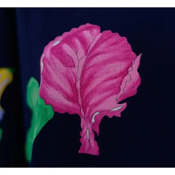 Excellent Condition Vintage Leonard Fashion Paris Patterned Shirt. Navy With Bright Colored Fruits, Shoes, Vegetable Pattern. Long Sleeve. 100% Cotton. Made in Italy- Size 3- fits like Large (please see measurements).Measurements (to nearest .25 in):Length (top of longest strap to tail): 25.0 inChest Width (Pit to Pit): 20.25 inFeel free to ask questions and Happy Shopping! Palm Beach Trends Item 6113