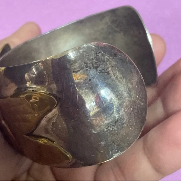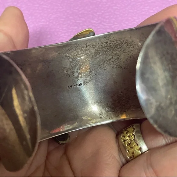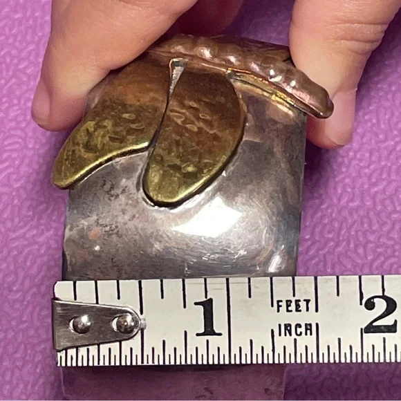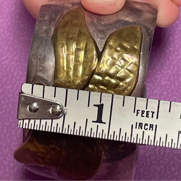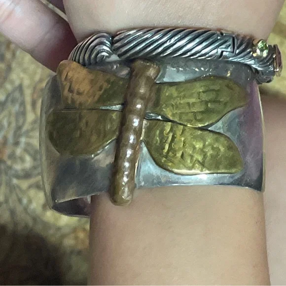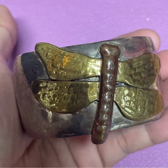 Art Deco Three-Dimensional DragonflyCuff Bracelet, in Mexican 925 Silver withBrass and Copper Dragonfly on Solidsilver Cuff. A real statement piece andclearly Hallmarked to the rear MEX925.In very good aged patina.Please see allPhotos for detailsJust let me know if you have any questions and I’m happy to answerPlease check my other listing tooReasonable offer is always acceptedMake an offer and happy shopping!